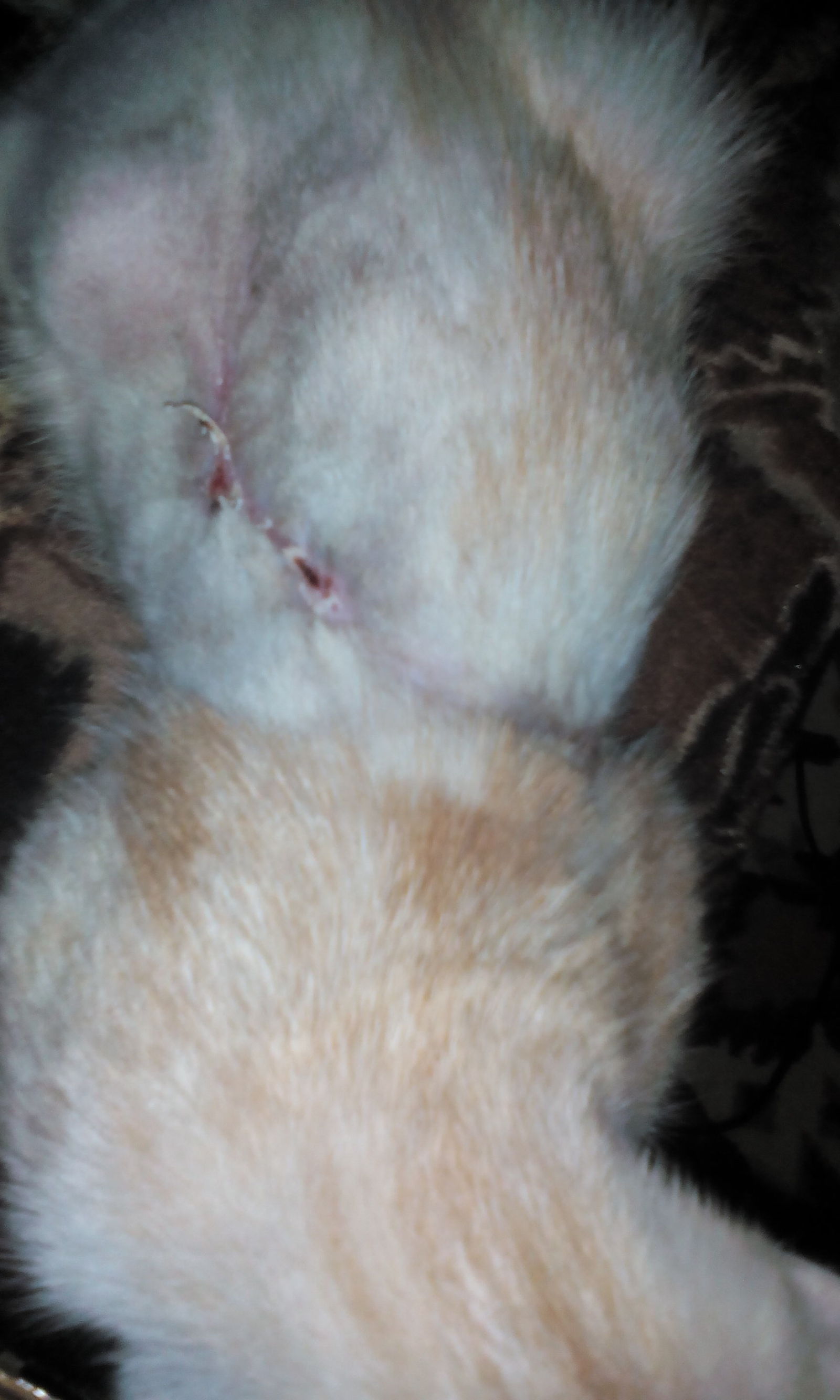 Проживала я загородом,в 50 км от областного центра.Ветеринарный кабинет как назло не работал.сама была на больничном без копейки денег. Поэтому оставалось только надеяться и верить.что все обойдется.но не тут-то было.. Через два дня обнаружила по бокам у котенка какие-то булькающие шишки,а через два часа одна из них лопнула- абсцесс. На животное было больно смотреть-шкура просто треснула . Обработала рану как могла подручными средствами-перекисью, хлоргексидином. левомеколем,стрептоцидом. Забинтовала.