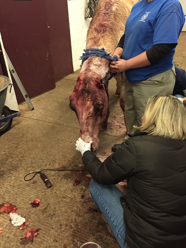 Владелец лечить коня не хотел и соответственно за это взялись уже защитники. Из травм: нет ушей, нет правого глаза, множественные раны головы, язвы роговицы, практически полностью отсутствуют веки, серьезные травмы ног (повреждения сухожилий), перелом челюсти (часть пришлось удалить)