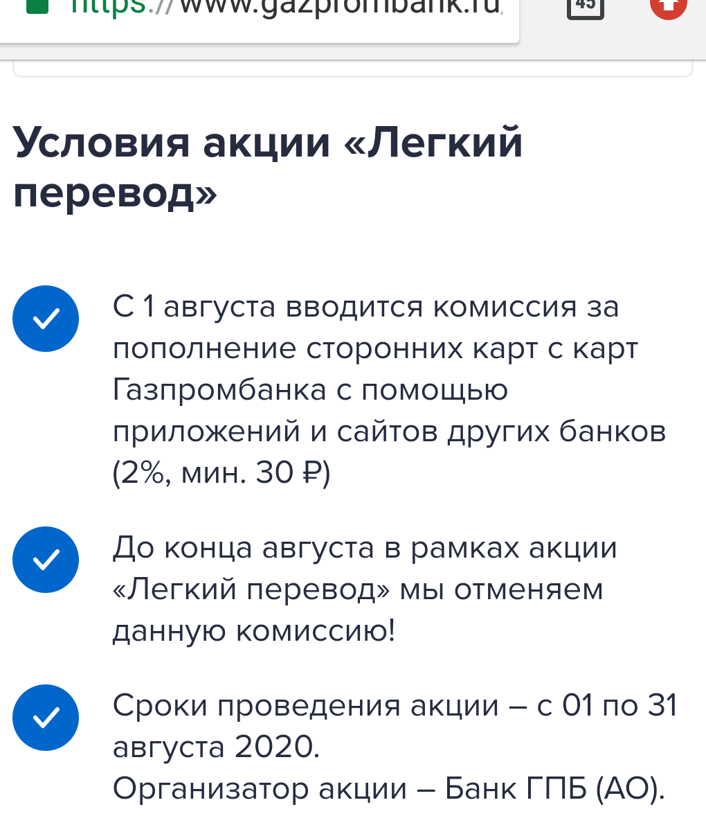 5 Vacoola Спасибо, ГазПромБанк! 5 лет назад Сегодня пришло сообщение от ГазПромБанка: Ну ништяк, чё, по 31 августа можно без комиссии деньги между картами кидать, правда до этого в приложении и без акции можно было перекидывать без комиссии. Здорово совпало) Газпромбанк Акции Скриншот Ещё 0
