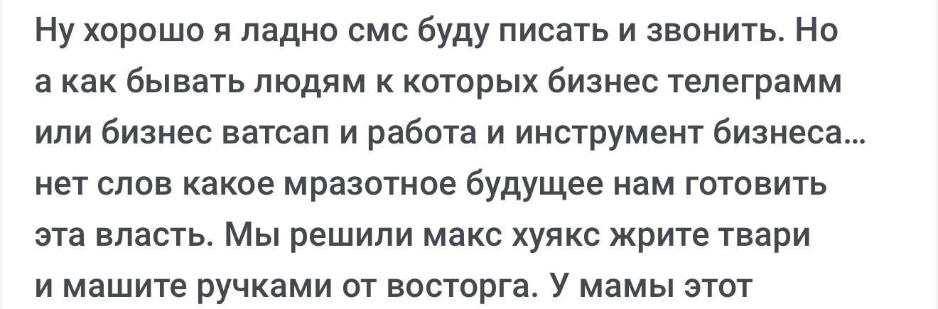 Ну хорошо я ладно смс буду писать и звонить. Но а как бывать людям к которых бизнес телеграмм или бизнес ватсап и работа и инструмент бизнеса… нет слов какое мразотное будущее нам готовить эта власть. Мы решили макс хуякс жрите твари и машите ручками от восторга. У мамы этот макс там предложения работой курьером как здрасте прилетают. Пипец скоро на авито буду покупать айфон с предустановленными ватсапом и телегой. Ну и мрази же Вы пиздулины Мизулины и вся ваша правительсьвенная шобла.
