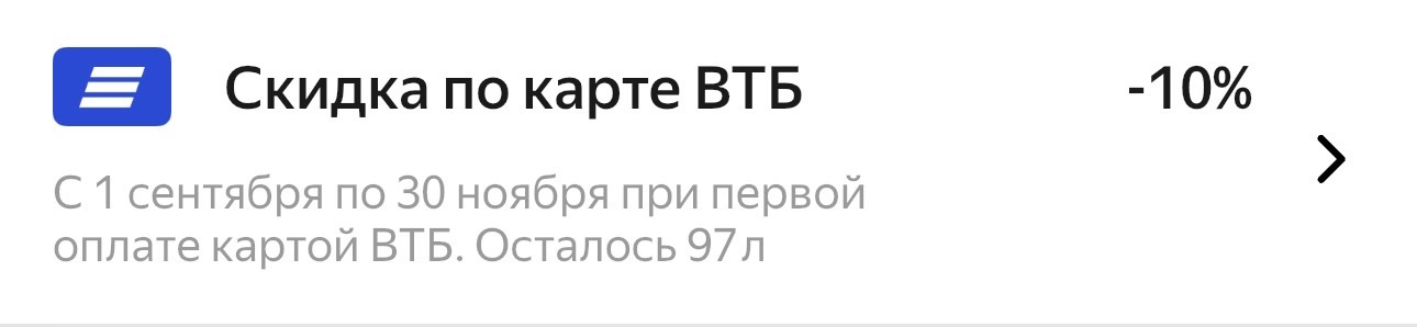 Да контора определенно со спорными и местами крайне хреновыми решениями, но за одно вам точно большое спасибо это за скидку при оплате на яндекс заправках, денег если подсчитать за год даже получается неплохо сэкономил.причем хоть и пишет первой оплатой, но заправляюсь я так постоянно, скидка всегда висит, но тут видимо так попадаю, что новая скидка появляется к моменту когда надо заправится.поичем нынешняя была на 300 литров, которые почти выкатал, заливаю обычно от 60л, и это у меня чуть больше полбака(туарег)