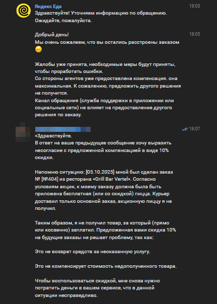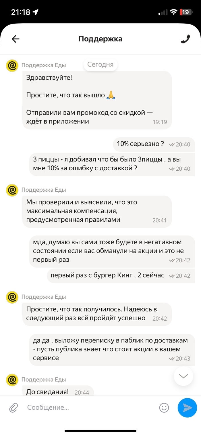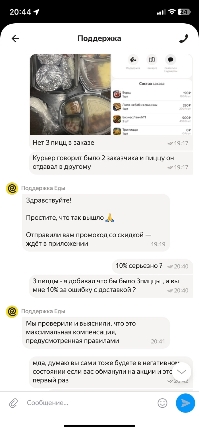 А если вы заметите и напишете в поддержку, вместо обещанной пиццы или возврата её стоимости вам великодушно предложат 10% скидку на следующий заказ. То есть, вас самих же заставляют снова заказывать и снова рисковать.