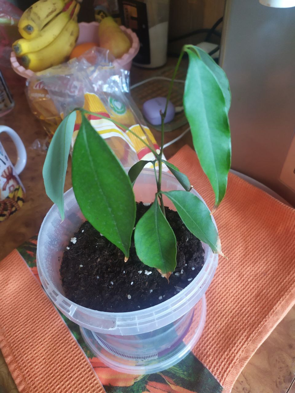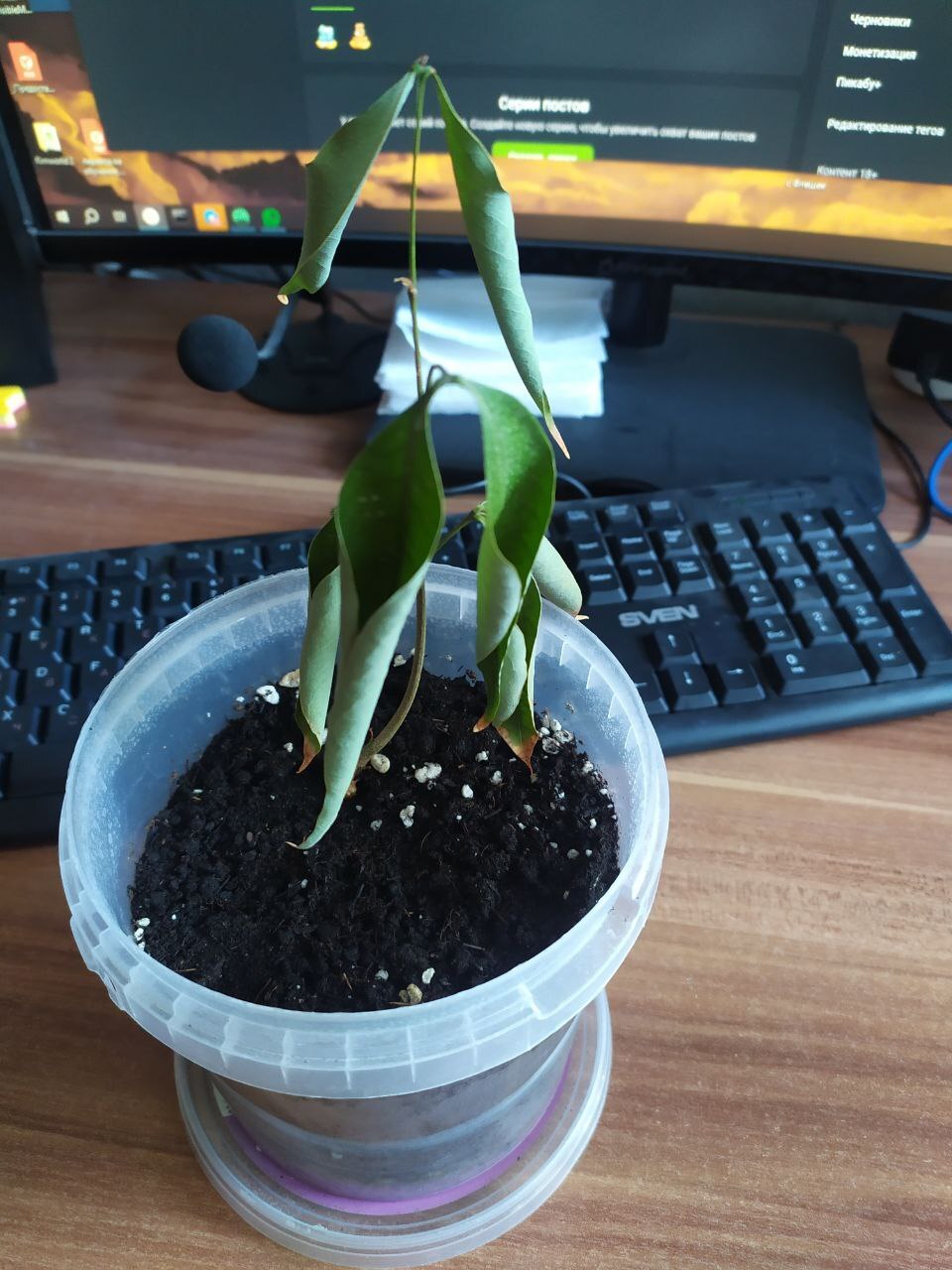Купили мы как-то в местных магазинах заморскую ягодку - личи. Вкусили, понравилось. Оставили от упаковки горстку косточек. Решила я попробовать прорастить их в домашних условиях, и получилось! Статистика всхода была грустной, из 12 выжил лишь один, но мне и того достаточно. Рос он крайне медленно, но выглядел вполне жизнеспособным и довольным условиями. Но что-то пошло не по плану, и стал личи загибаться... Сначала подсохли и приобрели ржавый оттенок кончики листьев, потом пятнышки и в центре листа появились. Пытался вырастить третий уровень, но точка роста дважды завяла. По внутренней стене "горшка" зелень пошла с одной стороны, как мох, не знаю, мешало ему это или нет?.. Вот так выглядел пациент.