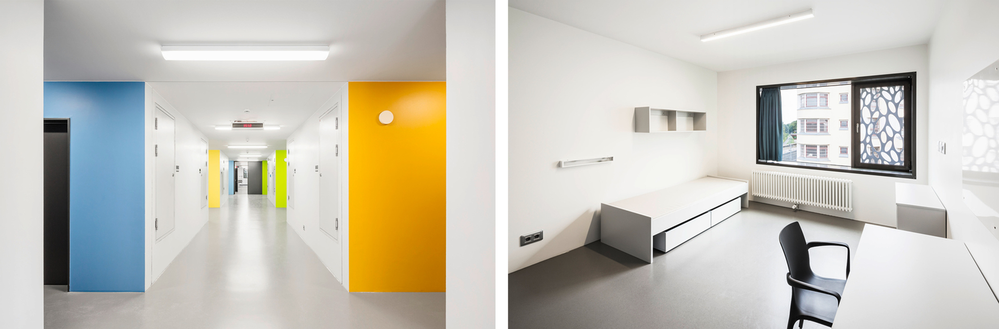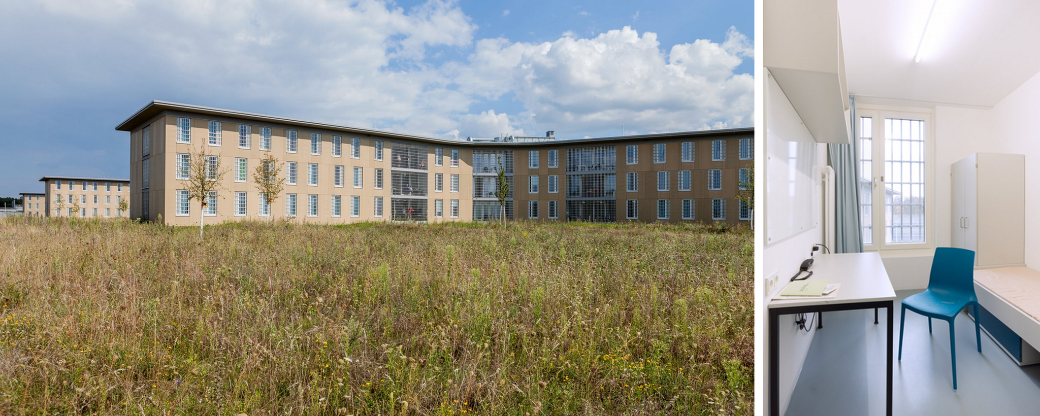Раз уж зашел разговор о европейских нормах, стоит взглянуть как выглядят современные тюремные учреждения там. Потому как мне кажется, вышеупомянутые «евронормы» подразумевают не только квадратные метры площади и отделение туалета стеной, а кое-что еще… Думаю, каждому попадались в интернете «завидные» комнаты норвежских тюрем, а также, относящиеся к ним, общественные пространства и спортзалы, которые, уж будем честны, зачастую выглядят куда лучше, чем большинство наших студенческих общежитий и университетских спортзалов. Так что я направила свой поиск на местные, т.е. немецкие, относительно недавно возведенные места заключения. Первое что привлекло мое внимание, была, конечно, архитектура. Функциональное назначение объекта часто выдает лишь высокий забор по периметру и решетки на окнах. Без них здания вполне можно принять за новый учебный корпус или клинику.