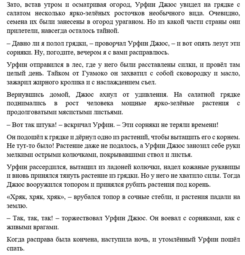 «Урфин Джюс и его деревянные солдаты» вышла в 1963 году. Собственно, завезли мы его на территорию СССР в конце 40-х, прекратили массовое выращивание и целенаправленное распространение к 80-м. Так что 60-е — это эпоха, когда борщевик был на коне. Он ещё не одичал, с задачей силосной культуры справлялся, то, что он влияет на качество молока и мяса, ещё не было очевидным. С другой стороны, вышеописанные обстоятельства играют и в обратную сторону — борщевик ещё не был столь одиозным, он не одичал, не вышел из-под контроля и не начал систематически уничтожать экосистемы, куда проникал.