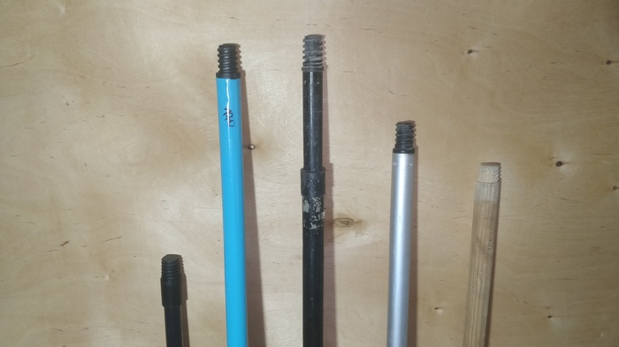Малярный стержень подойдёт к большинству современных швабр. Даже при небольшом отличии в резьбе пластик стерпит и за счёт глубины посадки держаться будет отлично. Проверил. Левая палка с чуть более мелкой резьбой. Это никак не помешало. А может это только внешнее отличие, а так шаг резьбы такой же.