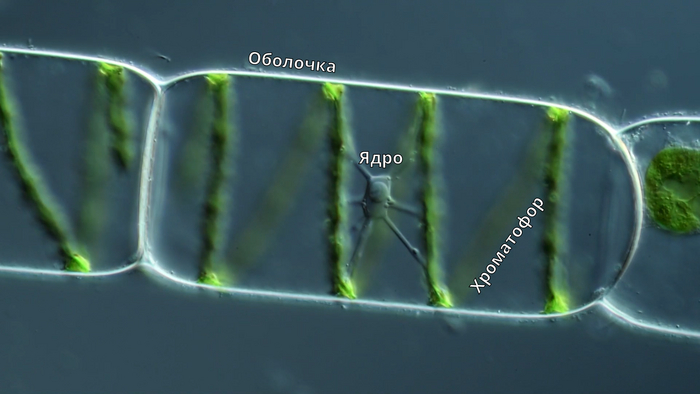 Оболочка клеток состоит из целлюлозы. В центре располагается массивное ядро, от которого отходит несколько цитоплазматических тяжей. Хлоропласты (фотосинтезирующие структуры) имеют очень необычную форму в виде тонких спирально закрученных нитей.