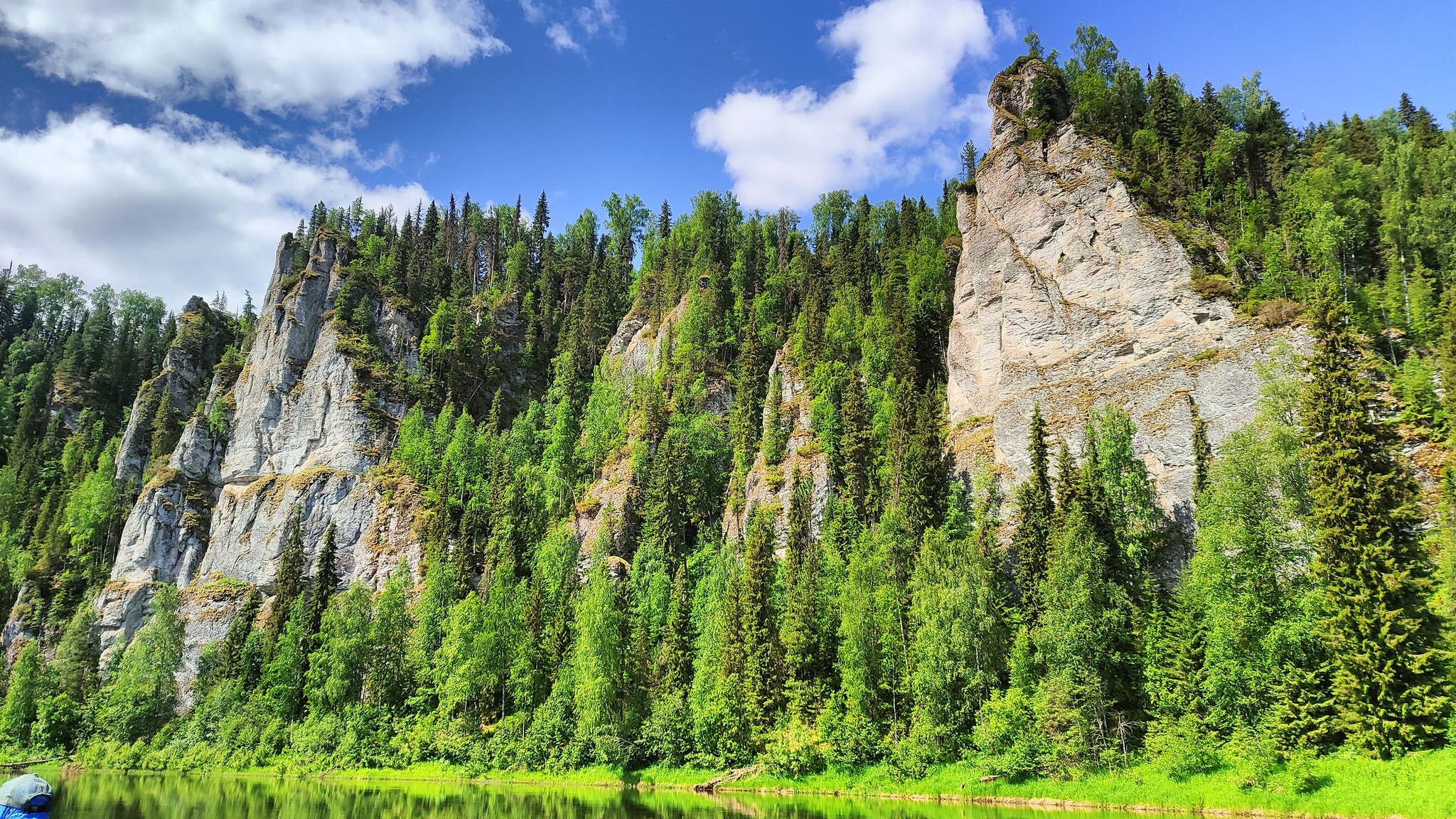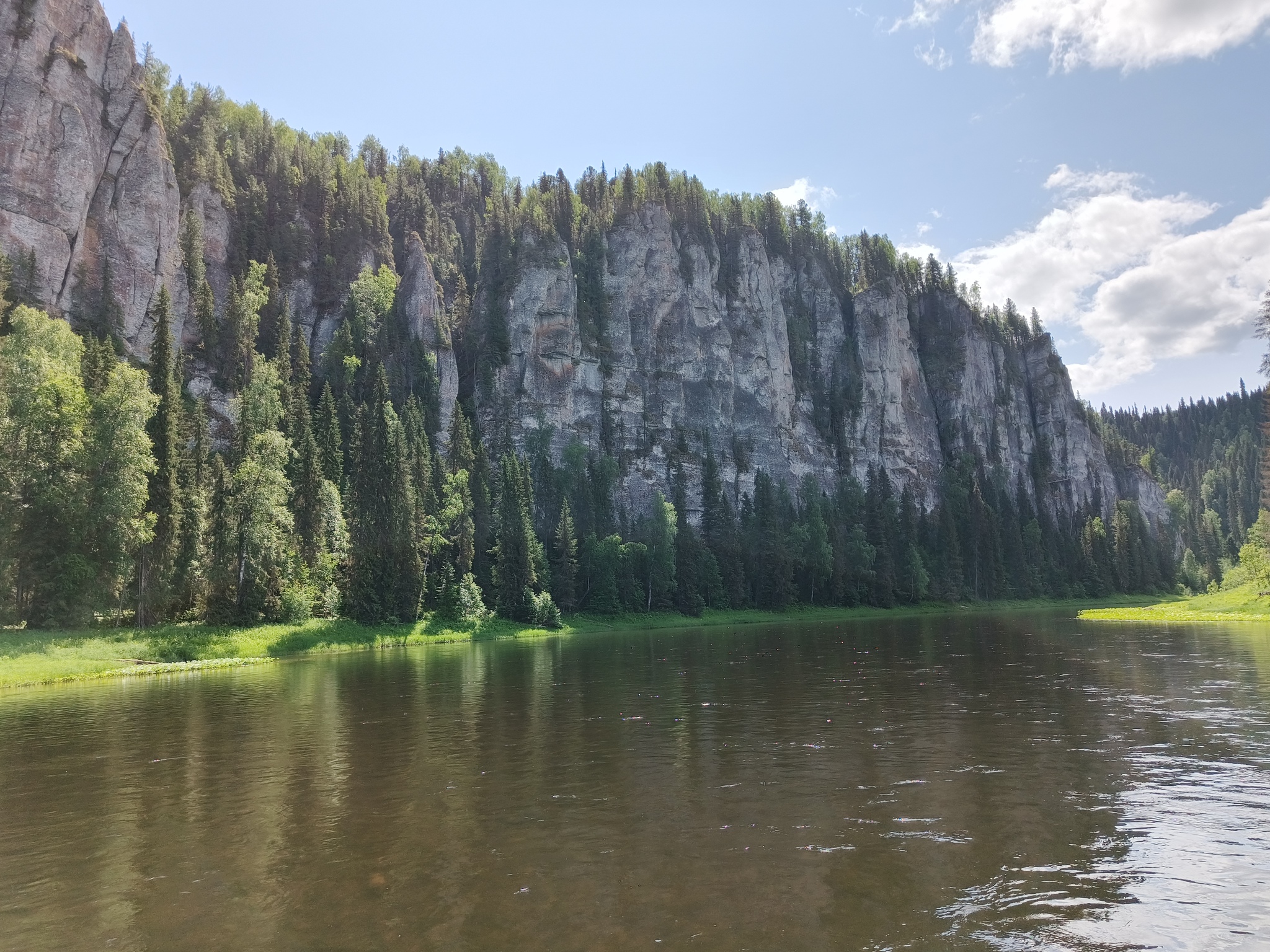 Заправив свои желудки едой, мы загрузили катамараны и отправились в дальнейшее путешествие. В этот раз мы умудрились выйти даже раньше 10 часов, так как путь нам предстоял не близкий. По плану мы должны были пройти 26 км. до поселка Валай. Река понемногу становилась медленнее, стали появляться плесы с не столь интенсивным течением, погодка разгулялась, и мы начали активно загорать. Рыба продолжала упорно молчать, так что оставалось только созерцать проплывающие мимо пейзажи. Попадалось много заросших лесом камней и островков.