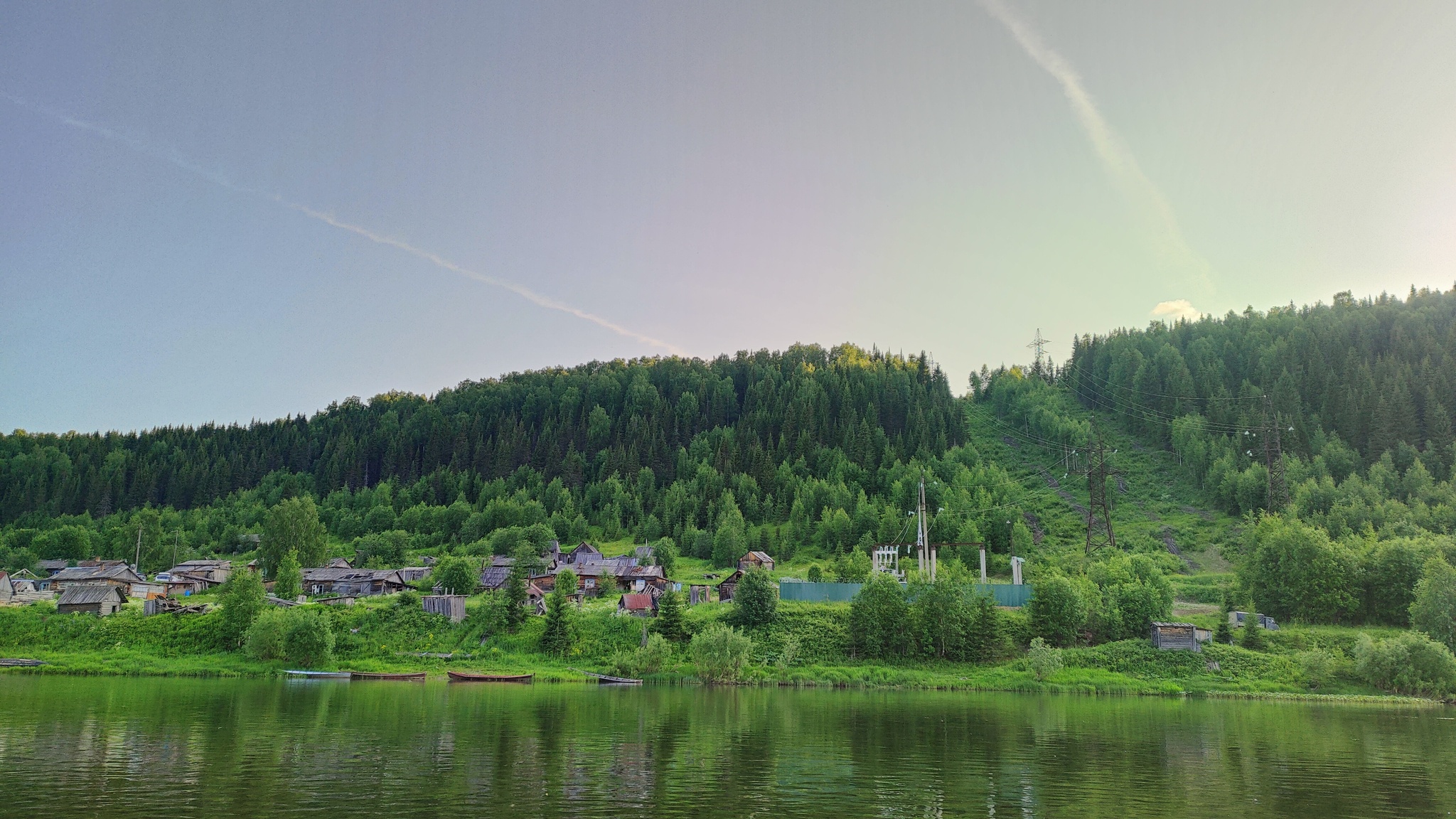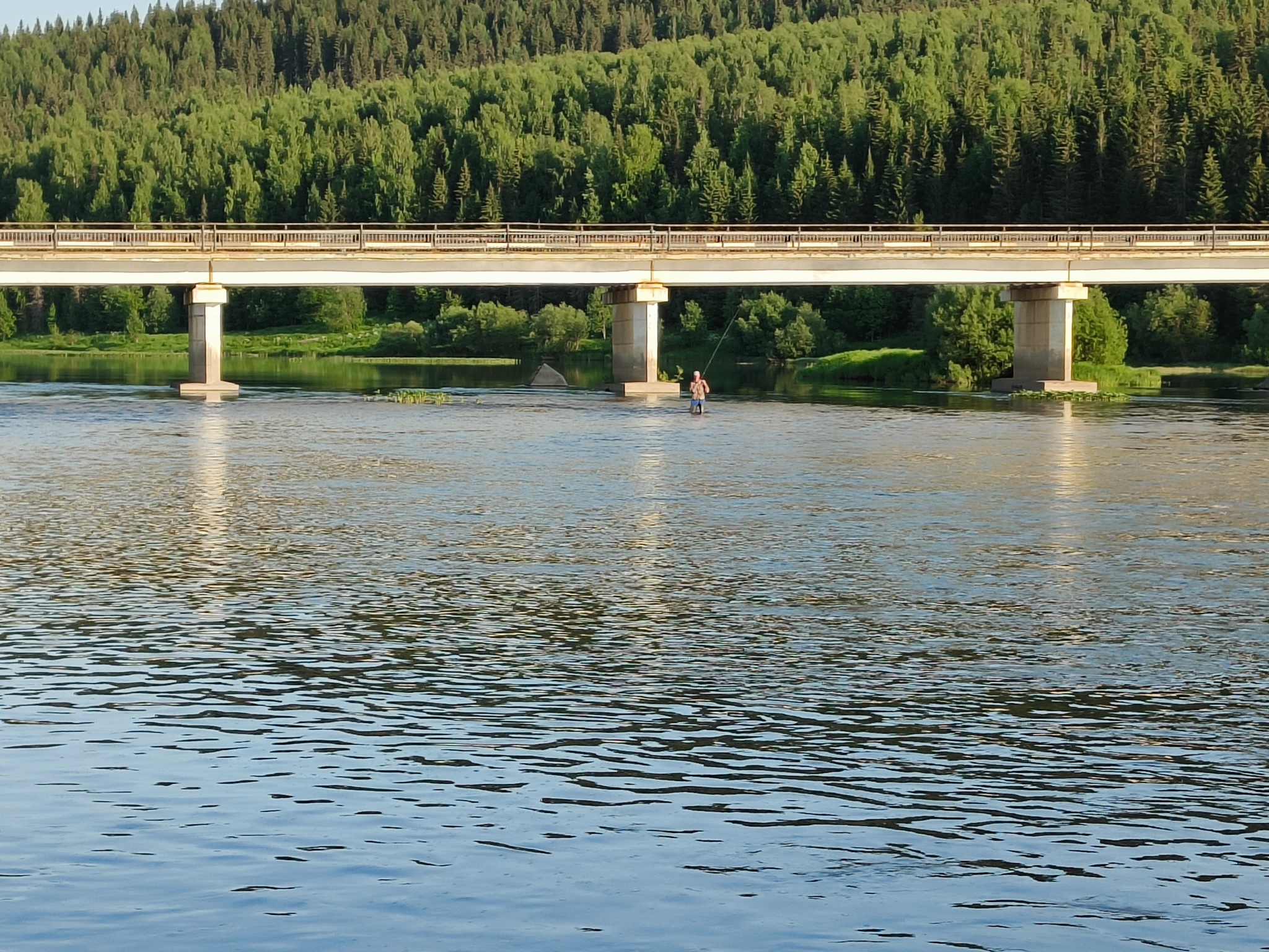 Вскоре перед нами показался Валай. По началу попадались лишь заброшенные домики, но ближе к мосту, по которому мы пересекали реку на автобусе во время заброса, какая-то жизнь еще теплится. Высоковольтная линия электропередачи обслуживается, в небольшом количестве присутствуют лодки и машины, стали попадаться рыбаки, ловящие хариуса на перекатах. Помня о сомнительной безопасности пути под мостом, мы осторожно подобрались к нему, выбрали наиболее чистый пролет и прошли под ним.