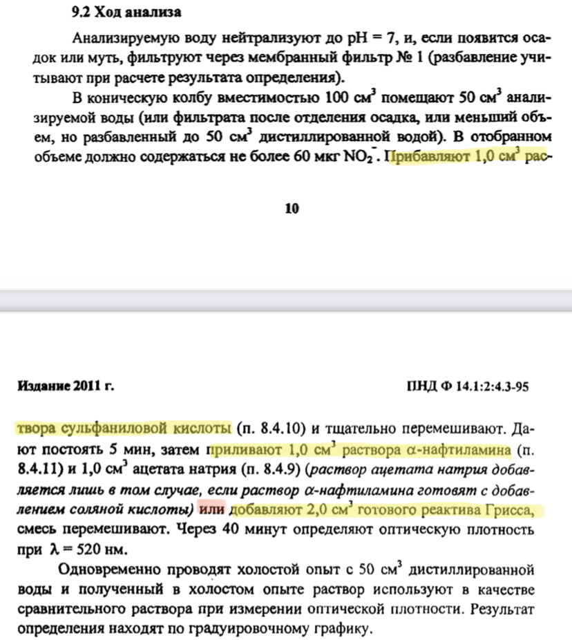 Доброго дня всем химикам, экологам и другим специалистам в смежных областях. У меня на работе идёт жесточайший спор по поводу трактовки методики ПНД Ф 14.1:2:4.3-95, измерение нитрит-ионов бла бла бла с реактивом Грисса. В ходе анализа изложен следущий алгоритм действий