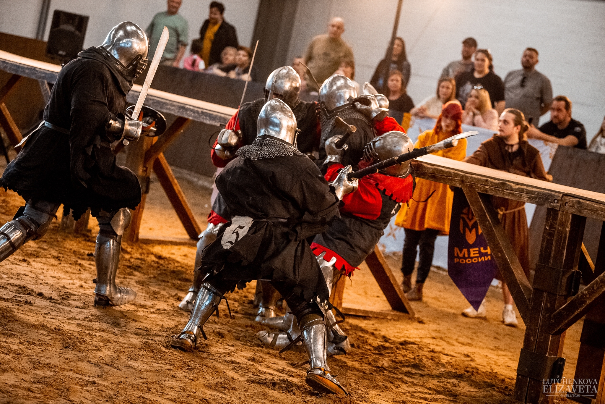 Представляю вашему вниманию Меч России — чемпионат по ИСБ в форматах пять на пять (где число означает количество бойцов в команде) и двенадцать на двенадцать. Латы — настоящие, оружие настоящее (но только не заточенное), столкновения сильные и уверенные.