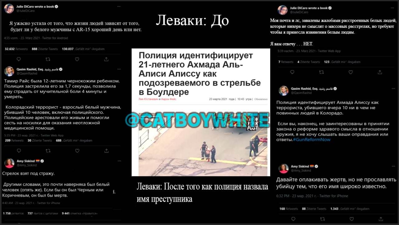 Посмотрите какие кульбиты делают видные леваки в твиттере, после того как выяснилось, что убийца не белый, а беженец из Сирии.