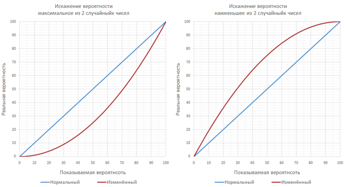 Тут 10% превращаются в 4.83%, а 75% в 88.18%. Но, что самое интересное, переход происходит при 30%, а не при 50%, как в среднем арифметическом. Поэтому если Вам хочется уж точно быть уверенными, что у игрока всегда будет преимущество, то достаточно удостовериться, что его минимальная меткость никогда не будет ниже 30%, а у врагов она будет настолько низкой довольно часто (для врагов можно использовать и среднее арифметическое, или что-то еще более искаженное).