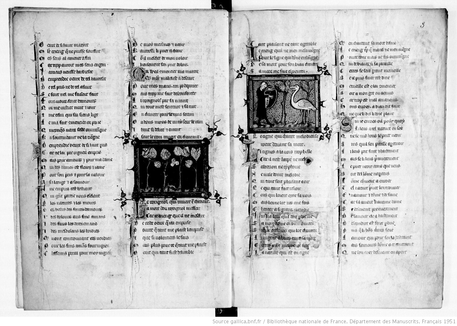 Несчастная птичка, не понимающая ничего в продукте — это удивительно хорошо нарисованный лебедь (удивительно, потому что, например, на идентичной картинке из любовного бестиария, folio 3r (https://gallica.bnf.fr/ark:/12148/btv1b90073757/f4.item), как и на многих других, его изобразили похожим не то на цаплю, не то на страуса — но, как мы помним, портретное сходство было не в чести у миниатюристов).