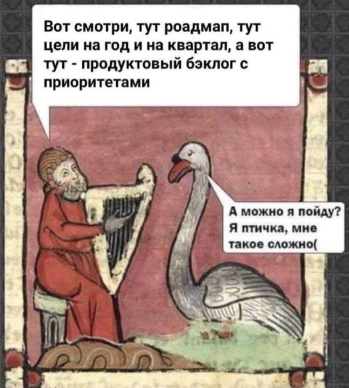 Христианское толкование лебединой предсмертной песни таково: лебедь учит нас не скорбеть и не страшиться перед лицом смерти, а, напротив, встречать ее благочестиво и готовиться к ней всю жизнь, как птица оттачивает свою единственную песню. А вы все роадмап, бэклог...