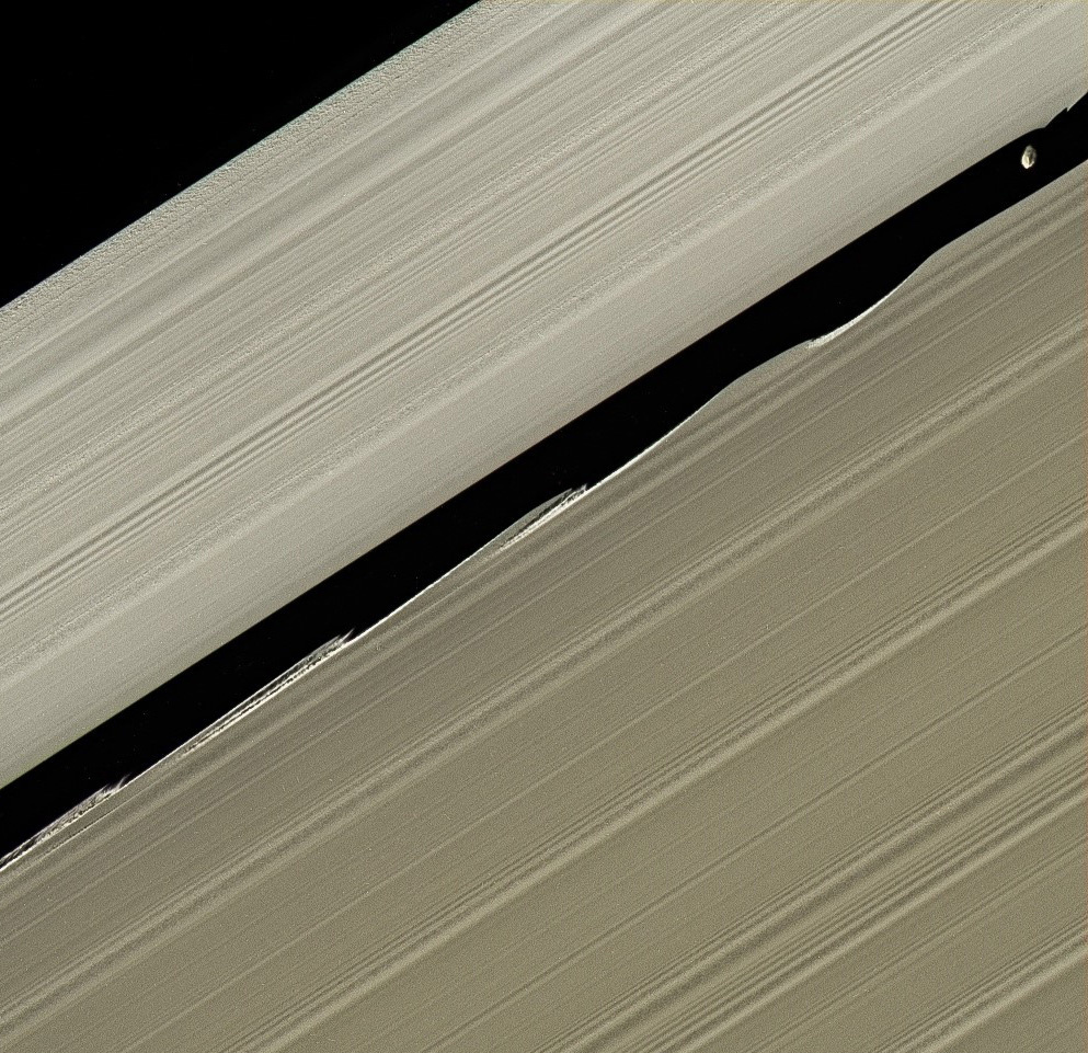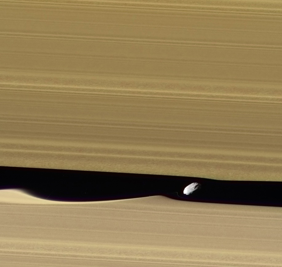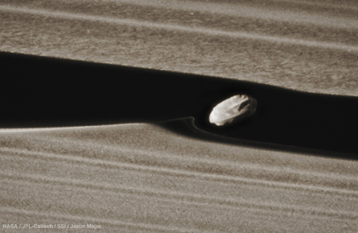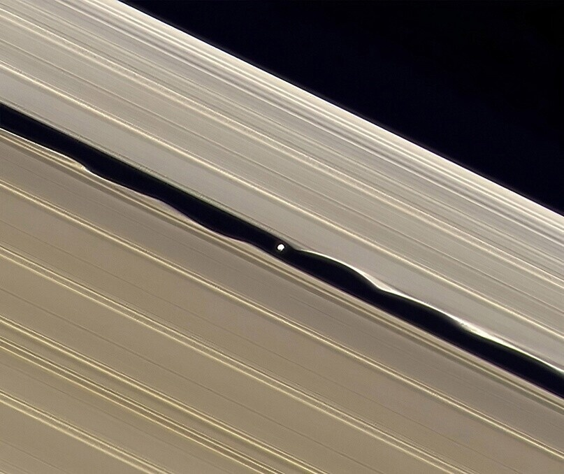 Интересным наблюдением стало то, что во время своего движения вокруг Сатурна, проходя вблизи колец, спутник при помощи своей гравитации подтягивает частицы кольца за собой, создавая вертикальные волны, которые видны на фотографиях, сделанных космическим аппаратом "Кассини".