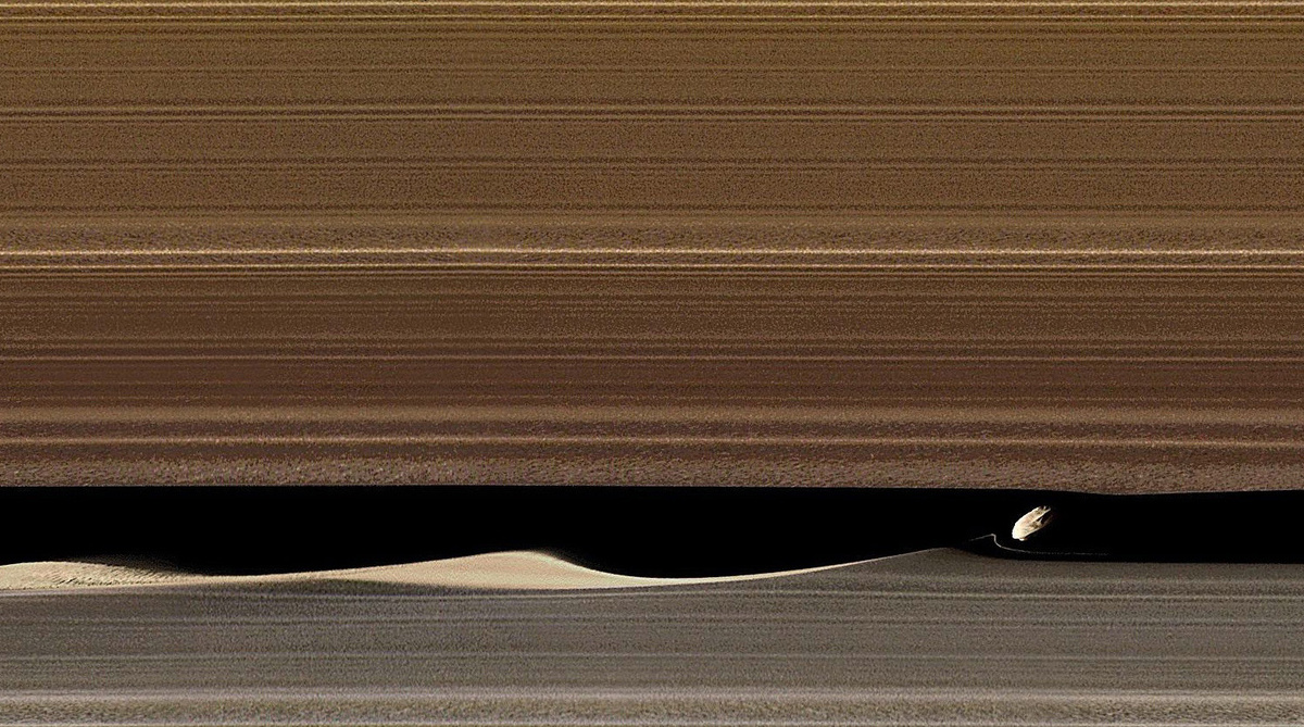 С такого ракурса кольца Сатурна выглядят немного забавно и чем-то напоминают виниловую пластинку. В центре снимка между колец Сатурна просматривается крошечный спутник Дафнис.