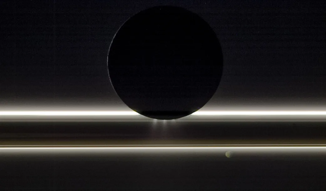 Спутник Сатурна Энцелад дрейфует перед кольцами и крошечной луной Пандорой на этом снимке, сделанном космическим аппаратом НАСА «Кассини» 1 ноября 2009 года. Вся сцена подсвечена Солнцем, обеспечивая яркое освещение ледяных частиц, составляющих как кольца, так и струи, исходящие от южного полюса Энцелада, который имеет около 314 миль (505 км) в поперечнике. Пандора, ширина которой составляет около (52 миль, 84 километра), находилась на противоположной стороне колец от Кассини и Энцелада, когда был сделан снимок. Этот вид также направлен на ночную сторону Пандоры, которая освещена тусклым золотистым светом, отраженным от Сатурна.