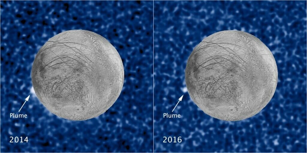 После – в 2014 и 2016 годах - «Хаббл» заснял шлейфы гейзеров на этом спутнике Юпитера в одном и том же месте: