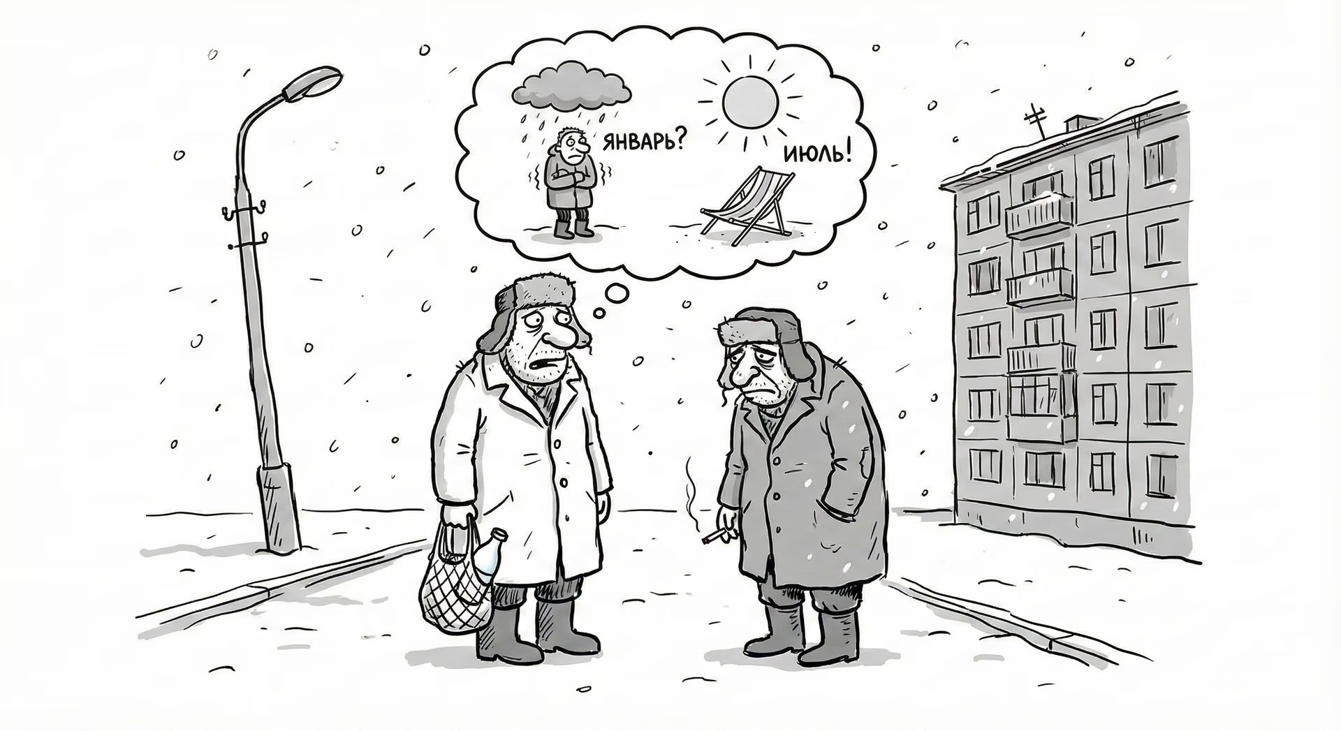 Третьего января я вышел на улицу за кефиром. Мир выглядел так, словно его пожевали и выплюнули. С неба сыпалась какая-то перхоть — не то снег, не то замерзшая тоска. Под ногами хлюпало. У магазина стоял мой сосед, Жора. Он был похож на памятник неизвестному алкоголику: монументален, неподвижен и покрыт инеем.