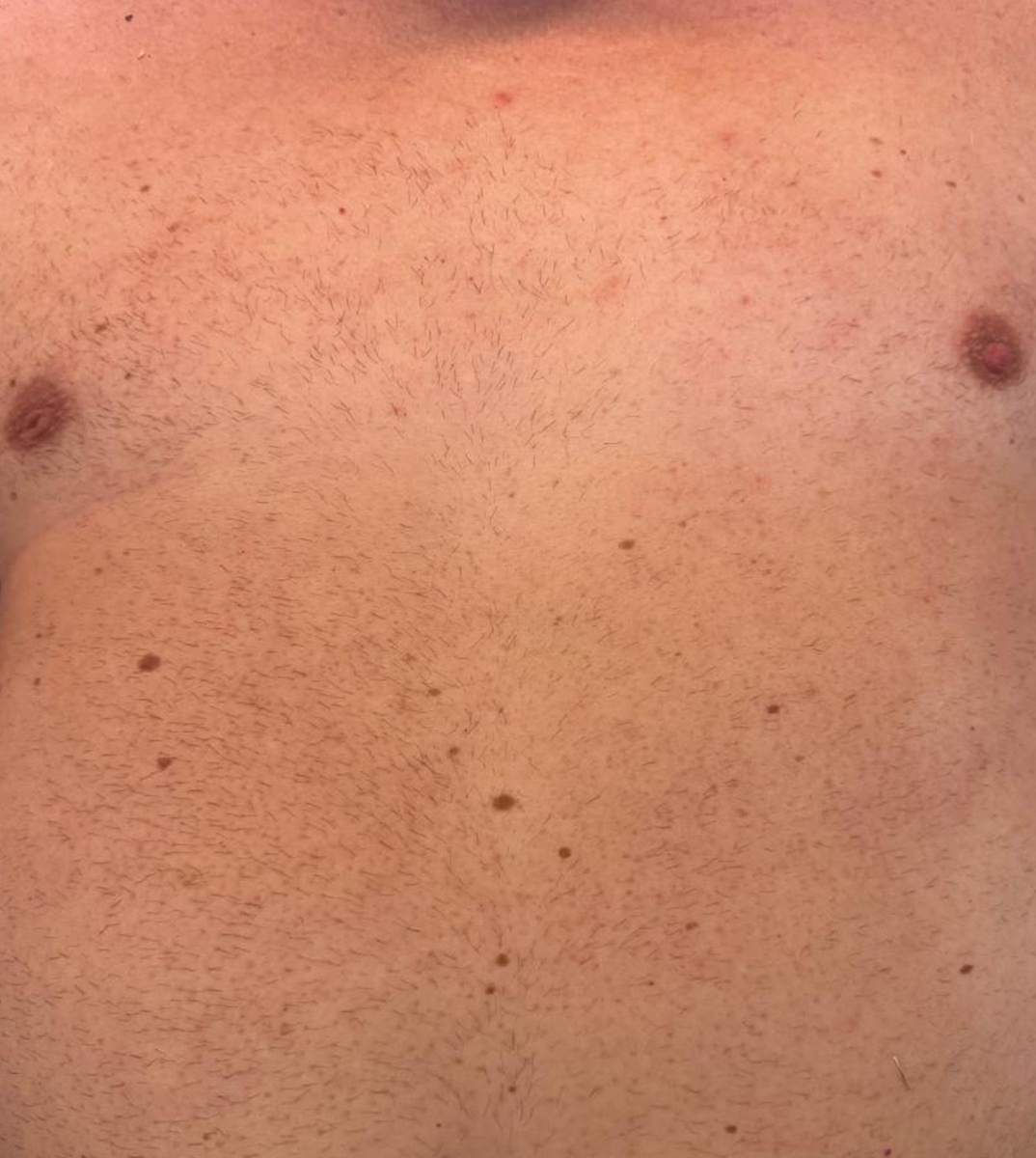 Через пару часов пошел в другую клинику на Александрит, также половину груди и живота. Ощущение от александрита очень болезненные, если сравнивать с диодной и нефритовой эпиляцией, я еле вытерпел, делали на минимальной мощности, волосы горят, запах неприятный как опаленная курица, делается без геля. Ушел весь красный, несколько дней краснота спадала, с пантенолом в обнимку спал, так как эффект как будто сгорел на солнце. Процедура вообще не понравилась из-за боли, но посмотрим на результаты может эти адские боли стоят этого, но увы смотрим фото.