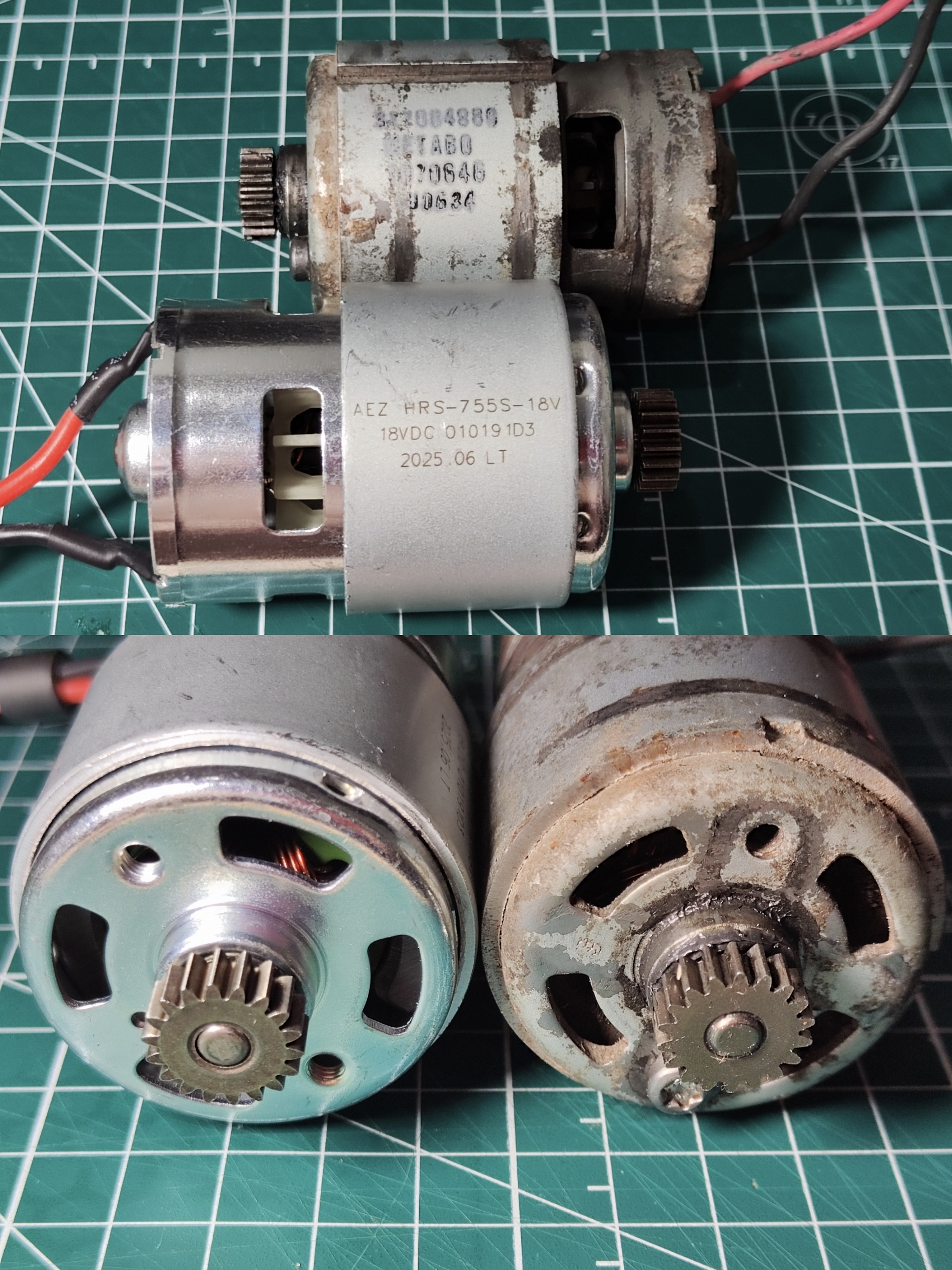 Отдали шуруповёрт Metabo BS18L в ремонт с жалобами "То работает нормально, то неистово свистит, пропадает тяга". Разобрал шурик, отдельно включил мотор и выявил проблему. Износилась передняя втулка, якорь имел большой люфт. Предложил заменить мотор. Новый оригинал стоил порядка 7000р, что сводило целесообразность ремонта на нет, поэтому было принято решение заказать копию за 1200р с Озона.