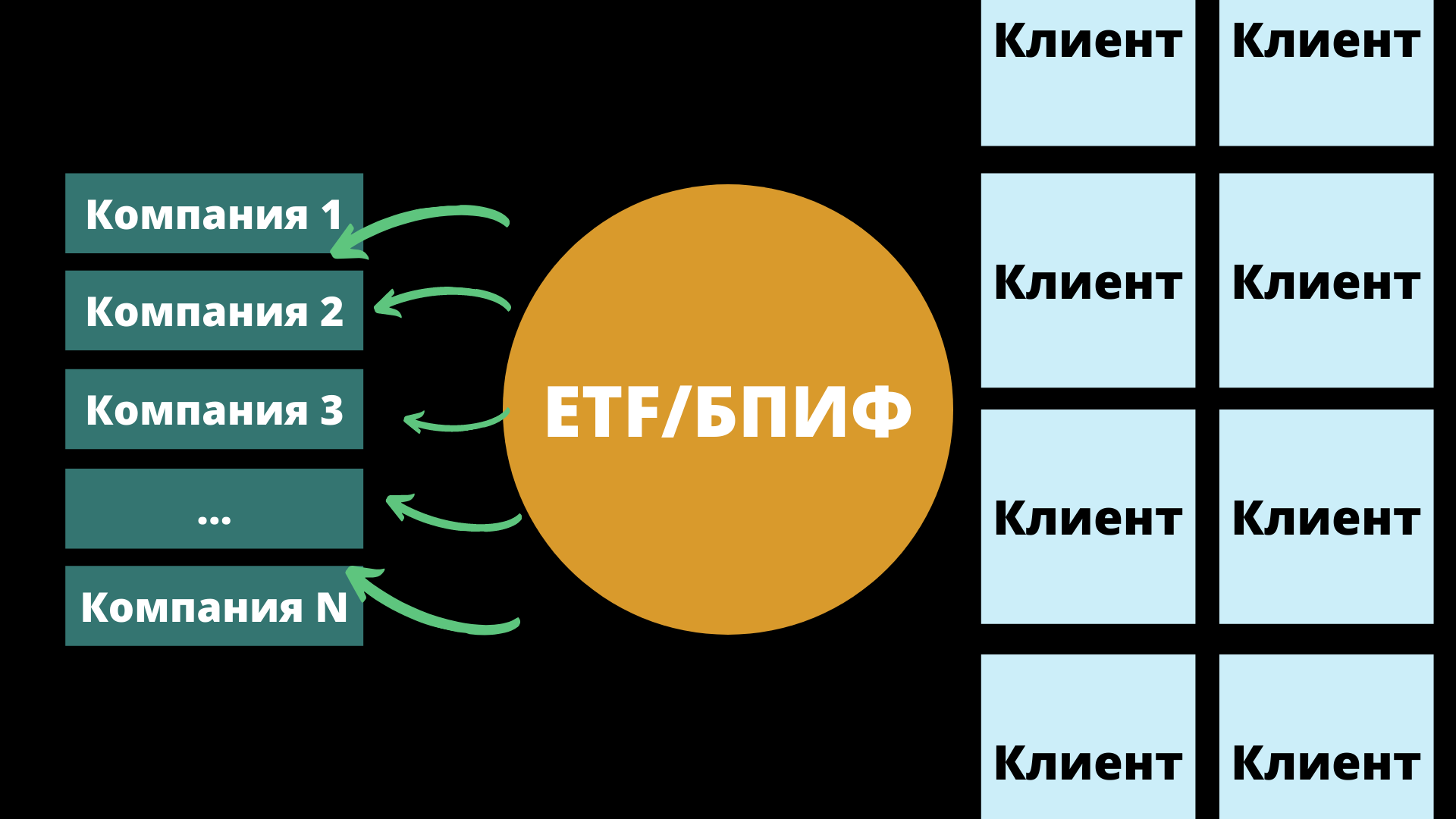 Для начала очень кратко о том, что такое ETF: это биржевой инвестиционный фонд, который собирает свой портфель из нескольких десятков или сотен ценных бумаг. Затем продаёт конечному инвестору (то есть нам с вами) небольшую частичку этого портфеля, которая называется паем. Таким образом покупка паёв индексного фонда позволяет инвестору вложиться сразу во много компаний, что крайне положительно сказывается на диверсификации портфеля.