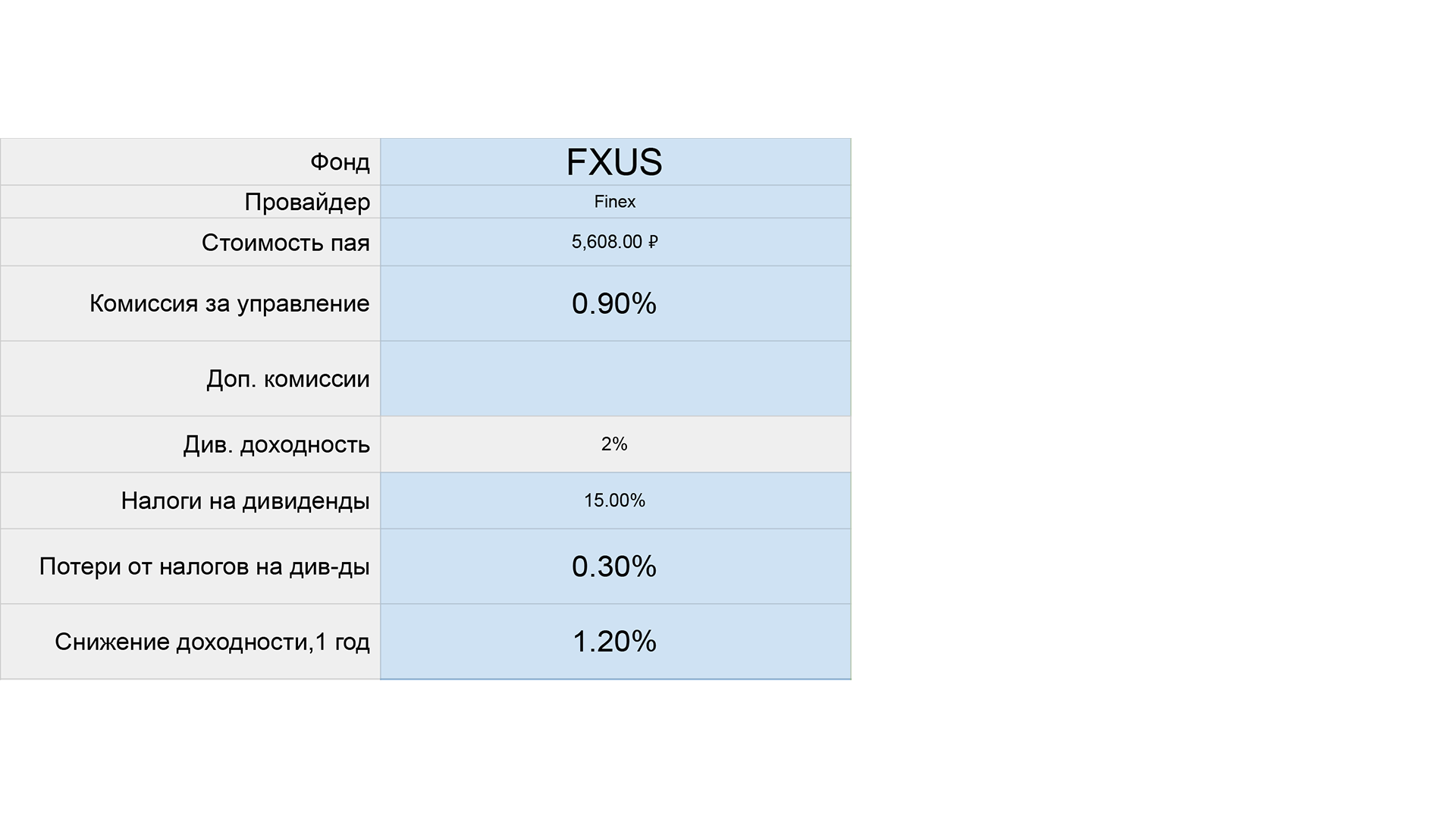 Фонд SBSP от Сбера, стоимость пая чуть более 1600 рублей, комиссия за управление 1% от стоимости активов в год, дивиденды не выплачиваются и облагаются налогом по ставке 30%. Учитывая комиссию за управление и потери на налогах на дивиденды, общее снижение ожидаемой доходности составит 1.59% каждый год. Обращу внимание, что при расчёте потери ожидаемой годовой доходности проценты комиссии за управление и процент налогов на дивиденды не складываются, а считается по принципу процент от процента, поэтому у фонда SBSP мы видим снижение на 1.59%, а не 1.6%. В случае FXUS получилось значение 1.2%, т.к. гугл таблицы округлили его до сотых долей, на самом деле там 1.197%.