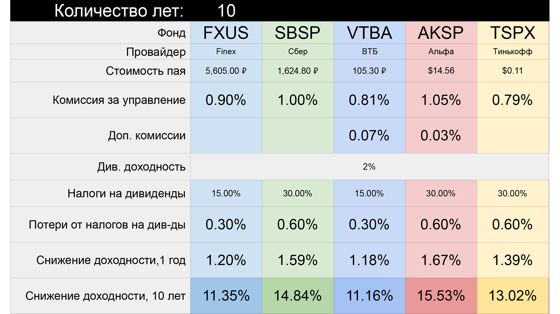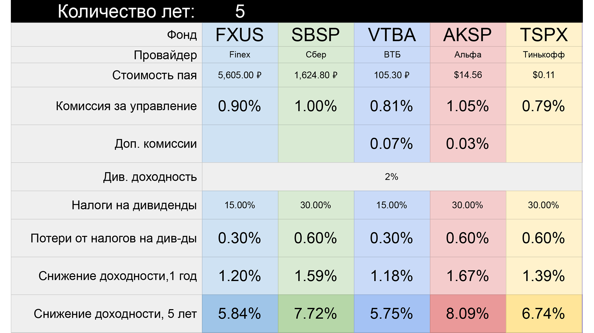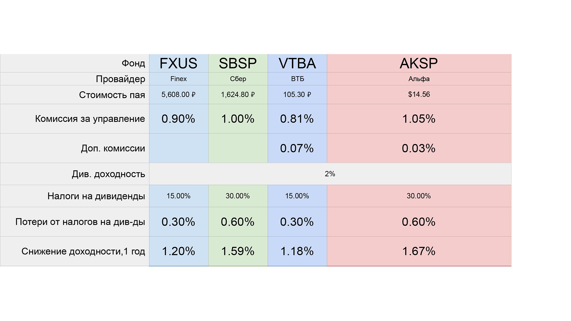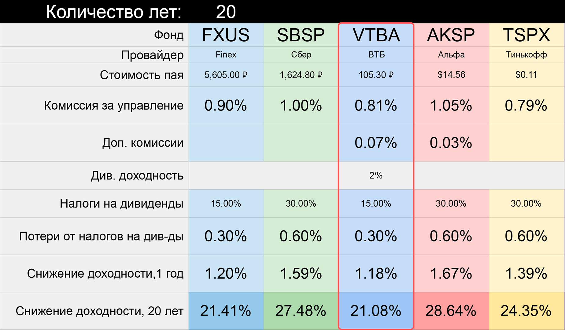 Казалось бы, по этой таблице наглядно видно, что у фонда VTBA от ВТБ-Капитал наименьшая из всех потеря доходности, значит он самый выгодный и нужно инвестировать только в него.