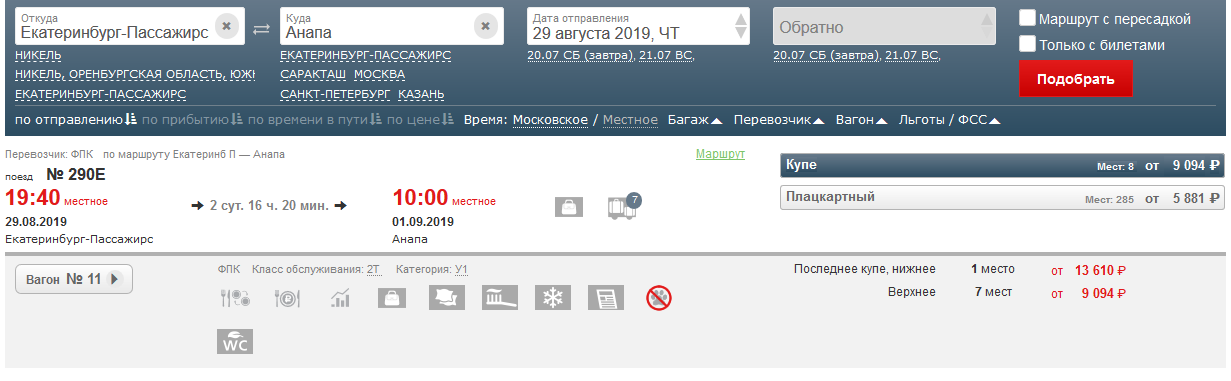 Решили съездить в Анапу к родственникам. Выбрали билеты от Уральских авиалиний из Екатеринбурга за 6 748 на 29 августа. Благополучно купили их, ну вроде бы и все. Довольные ждем конца августа. И решил для интереса посмотреть, на сколько дешевле стоит билет на поезд. Потому что помню, раньше ездили на поезде. чтобы сэкономить. Делаем запрос и.........