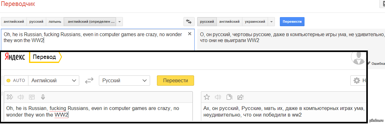 Semertak Сравним переводчики)) 10 лет назад Где-то в горячем сейчас байка о том как чувак играл в КС в Канаде и услышал там один комментарий. Ну я его в переводчик и загнал) И ничего необычного)) [моё] Переводчик Яндекс Google Без палева