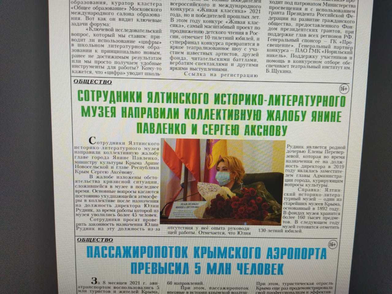 Похожая ситуация и в Ялтинском историко-литературном музее, где сотрудники направили коллективную жалобу главе города Янине Павленко, министру культуры Крыма Арине Новосельской и главе Республики Крым Сергею Аксёнову. Информация об этом ранее была распространена в СМИ и соцсетях.