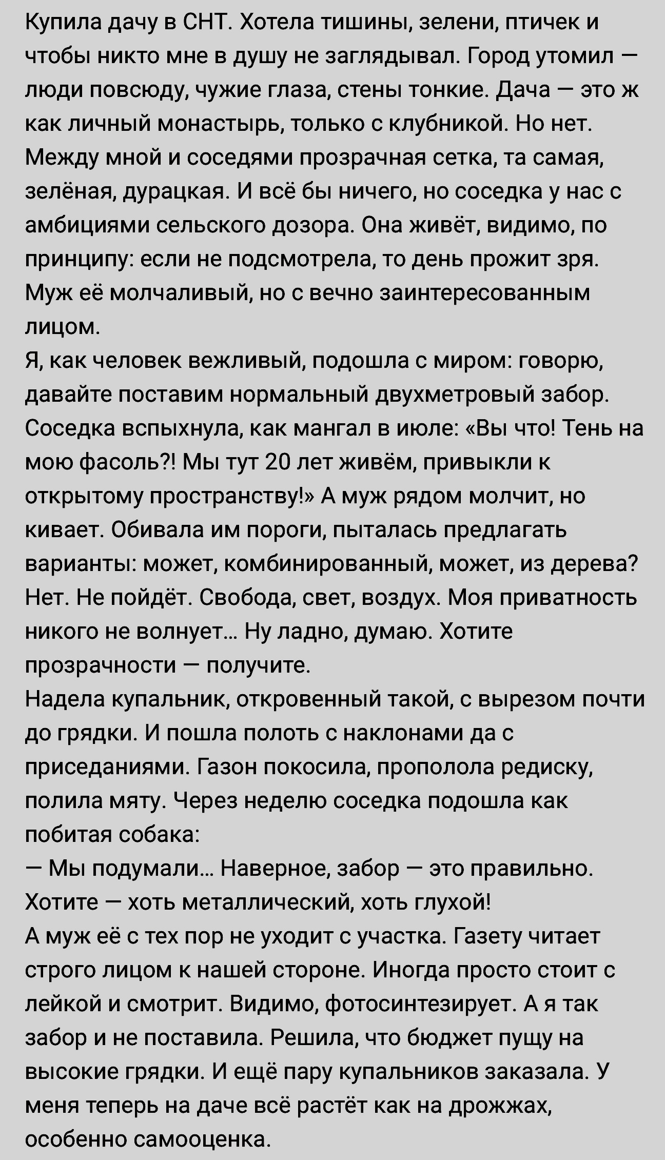 Даже если история придуманная, или реальная, но преувеличенная - это еще не значит, что такого не бывает в реальной действительности. Моя подруга молодости замуж вышла раньше меня, еще в универе, а у ее матери интерес корячиться на даче пропал, да и плюс возрастные заболевания позвоночника не позволяли перенапрягаться. Поэтому она радостно передала дачу молодым. В первые 2 года те туда только на шашлыки и для отдыха ездили, потом подругу укусил внутренний хомяк и она превратилась в хозяюшку. Засадила всяким вкусным и полезным вначале полдачи, а потом всю. Часто приглашала меня туда и в земле покопаться (я это дело тоже всю жизнь люблю) и вечером винца попить, и в караоке поорать, и поплескаться на речке в жару. И тоже с соседями не сплошной забор был, а из сетки рабицы с крупной ячейкой. С другой стороны же соседи еще до нас нормальный сплошной забор поставили.