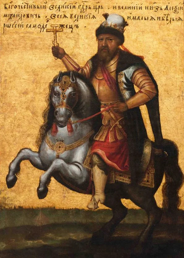 А, кстати. Это 17й век. ;) Начали рисовать парсуны. Вот Алексей Михайлович на коне. Конь, кстати, хищный, у него глазки вперед смотрят ;) В связи с этим считаю что жаба для монаха-писца изображена неплохо. )