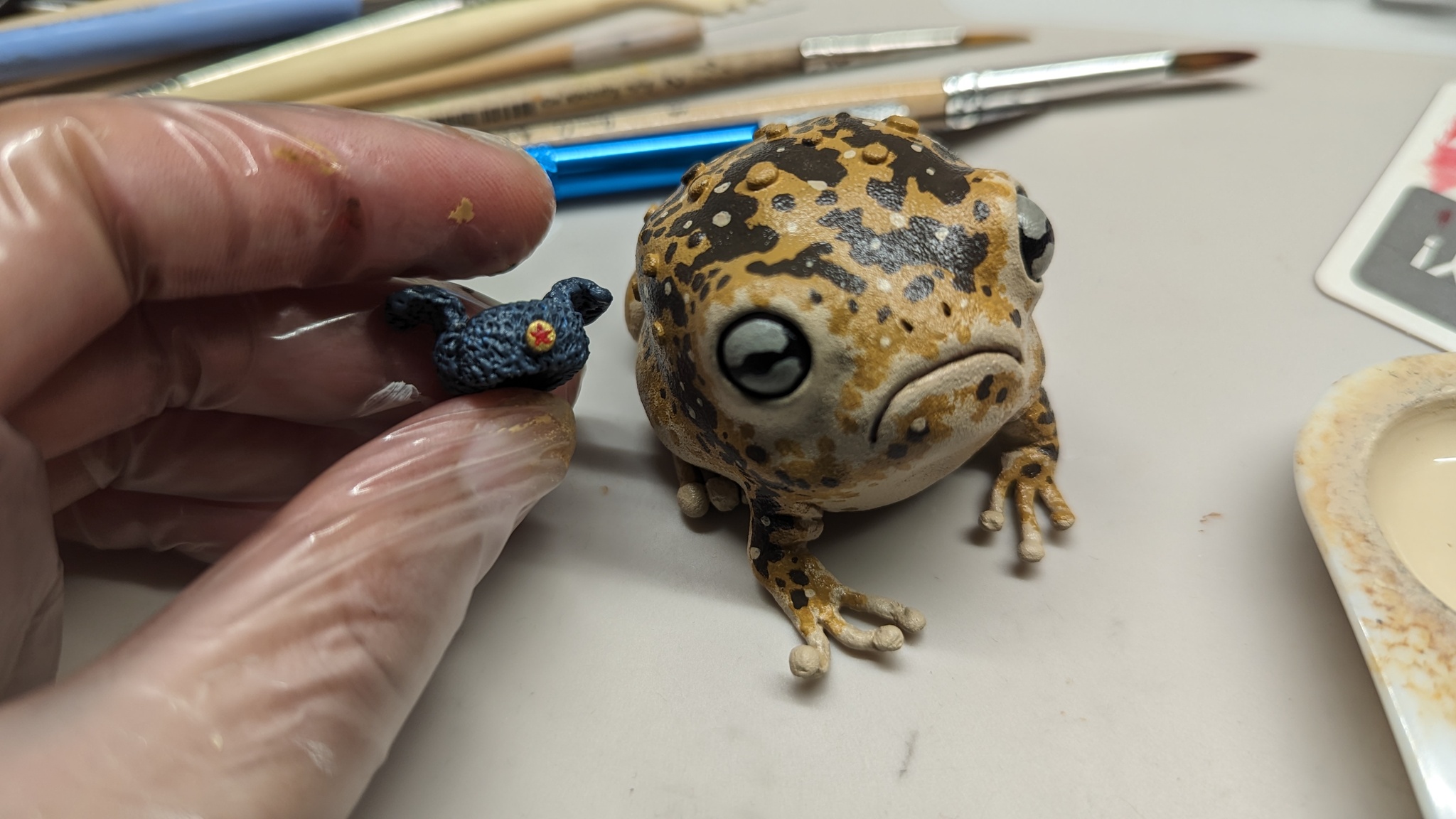 Фигурка счастливой жабы из полимерной глины. Раскрашена акрилом, покрыта глянцевым лаком. Шапка-ушанка - отсылка к мемной жабе из видео, которое можно найти, погуглив "Angry Squeaking Gopnik"