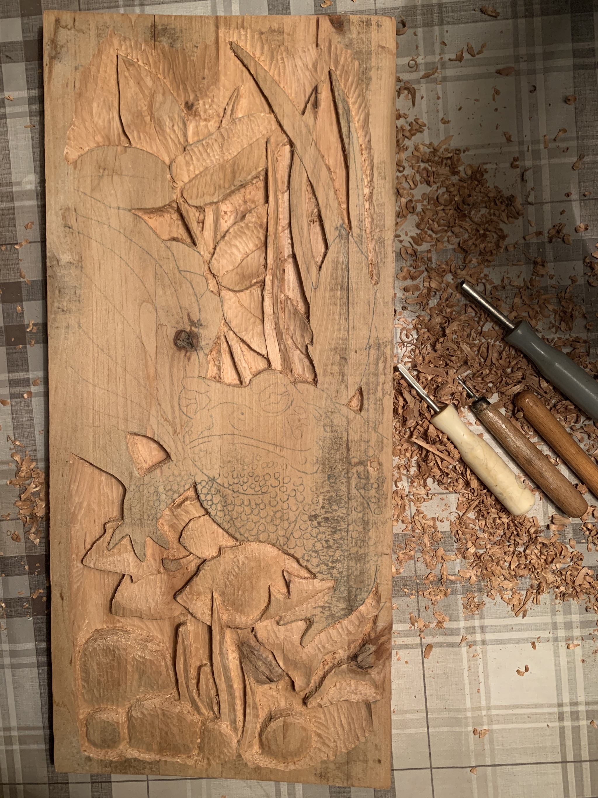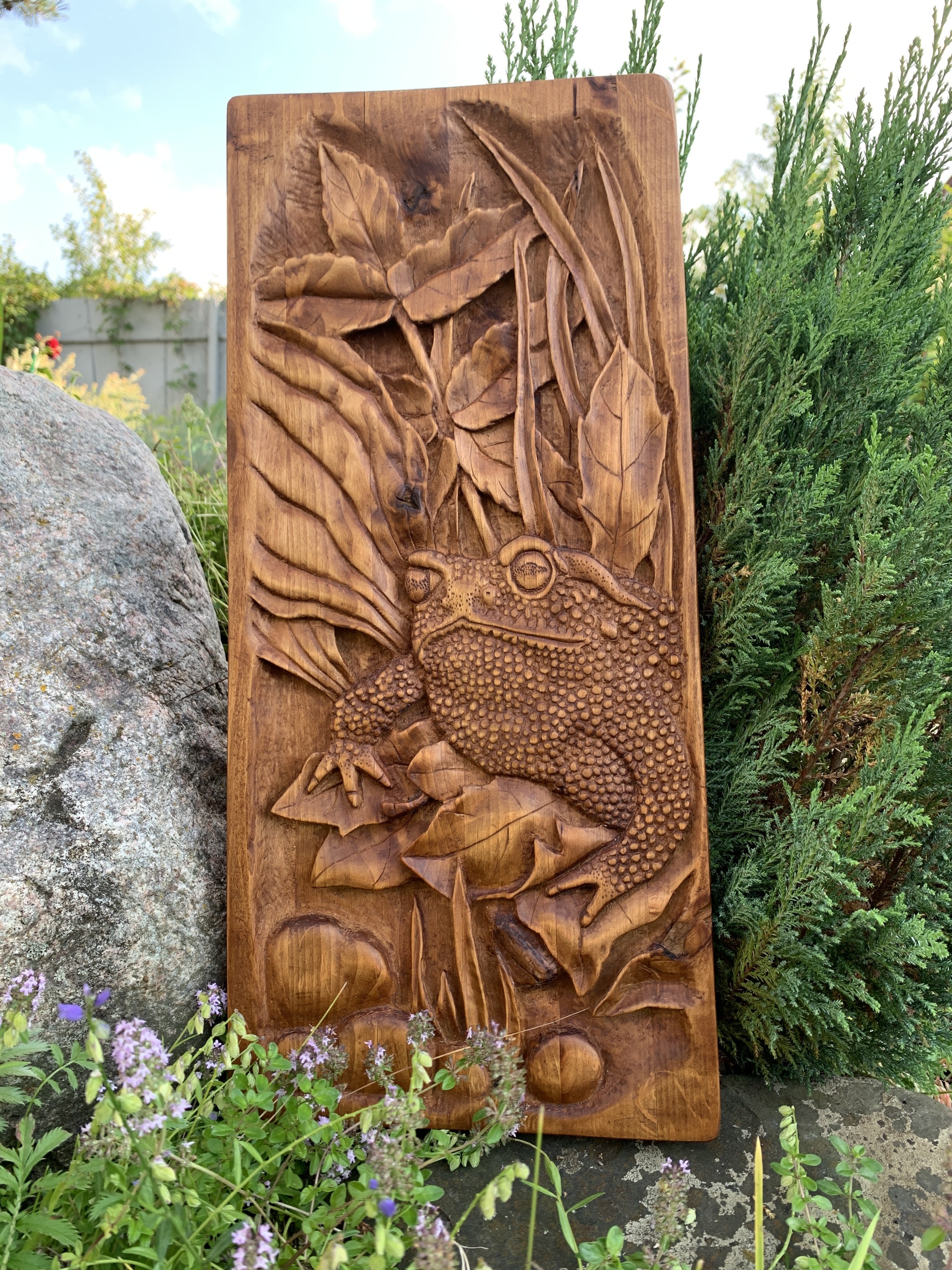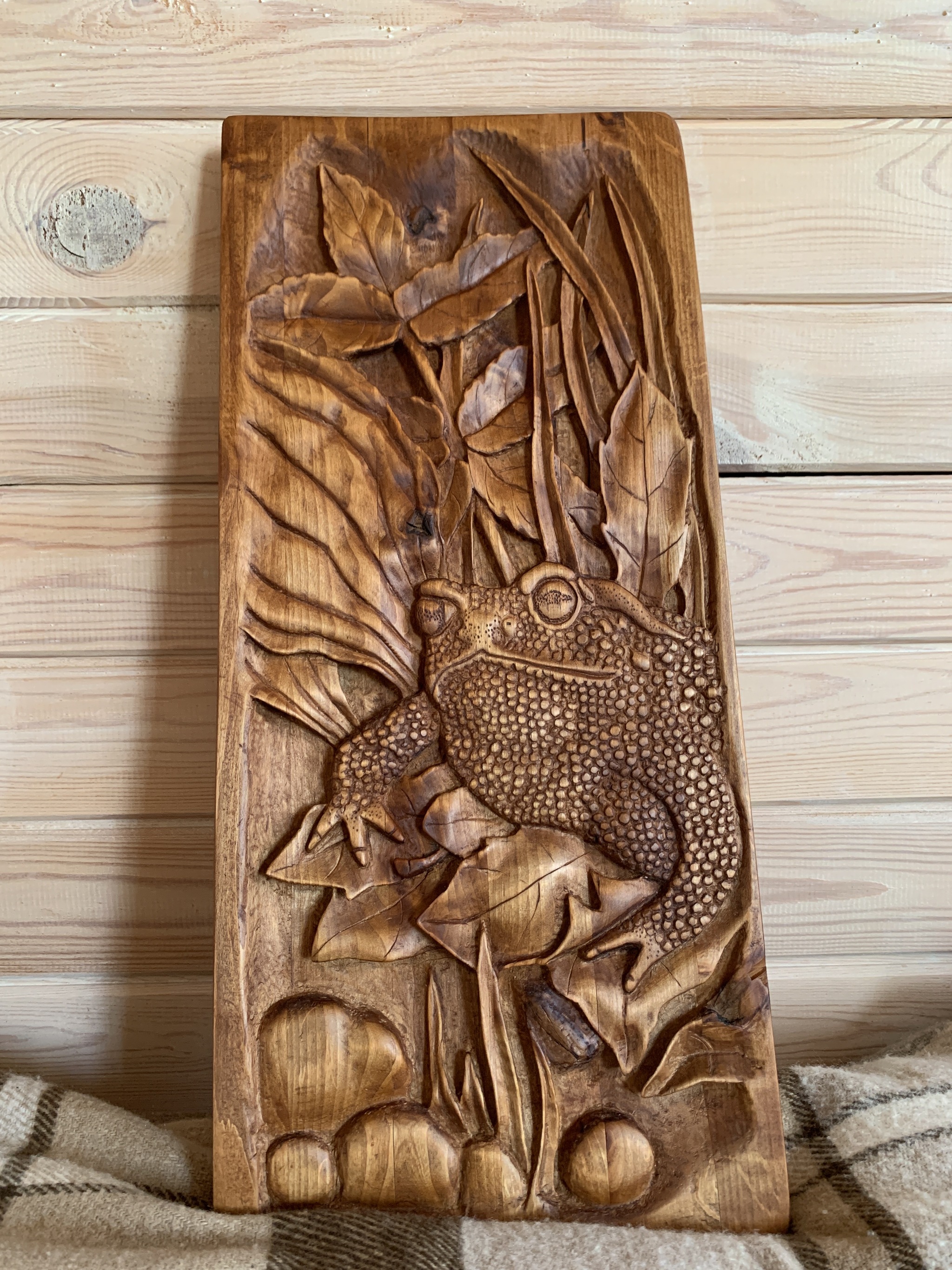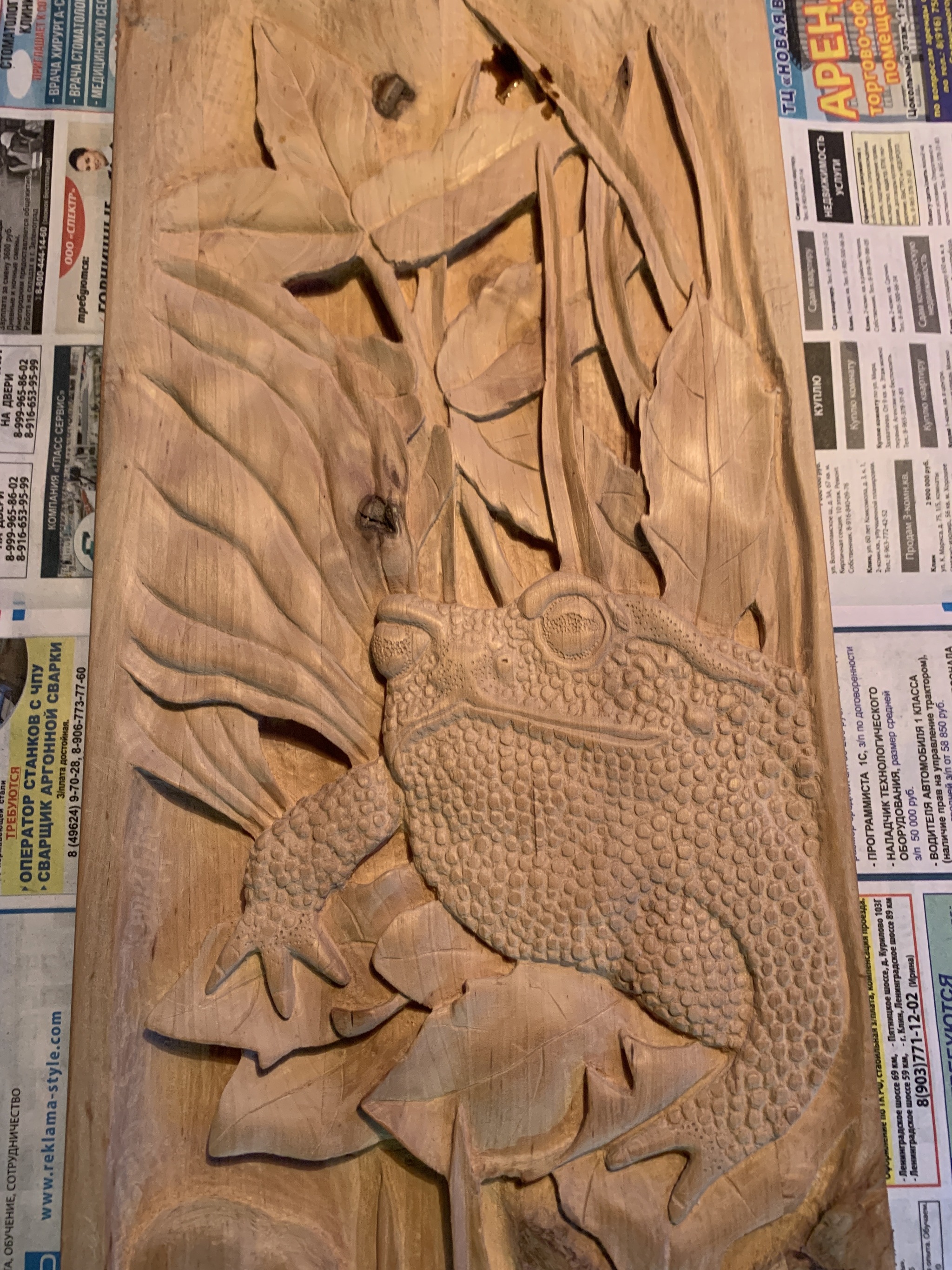 Вырезана из пятидесятилетней осиновой доски, дошедшей до полной кондиции в лесном домике после годов, проведенных под банками с закрутками и тазами с грибами. Она слышала умные разговоры и искренний смех, так что поддалась резьбе очень хорошо. Хотя эти пупырышки чуть не свели меня с ума…