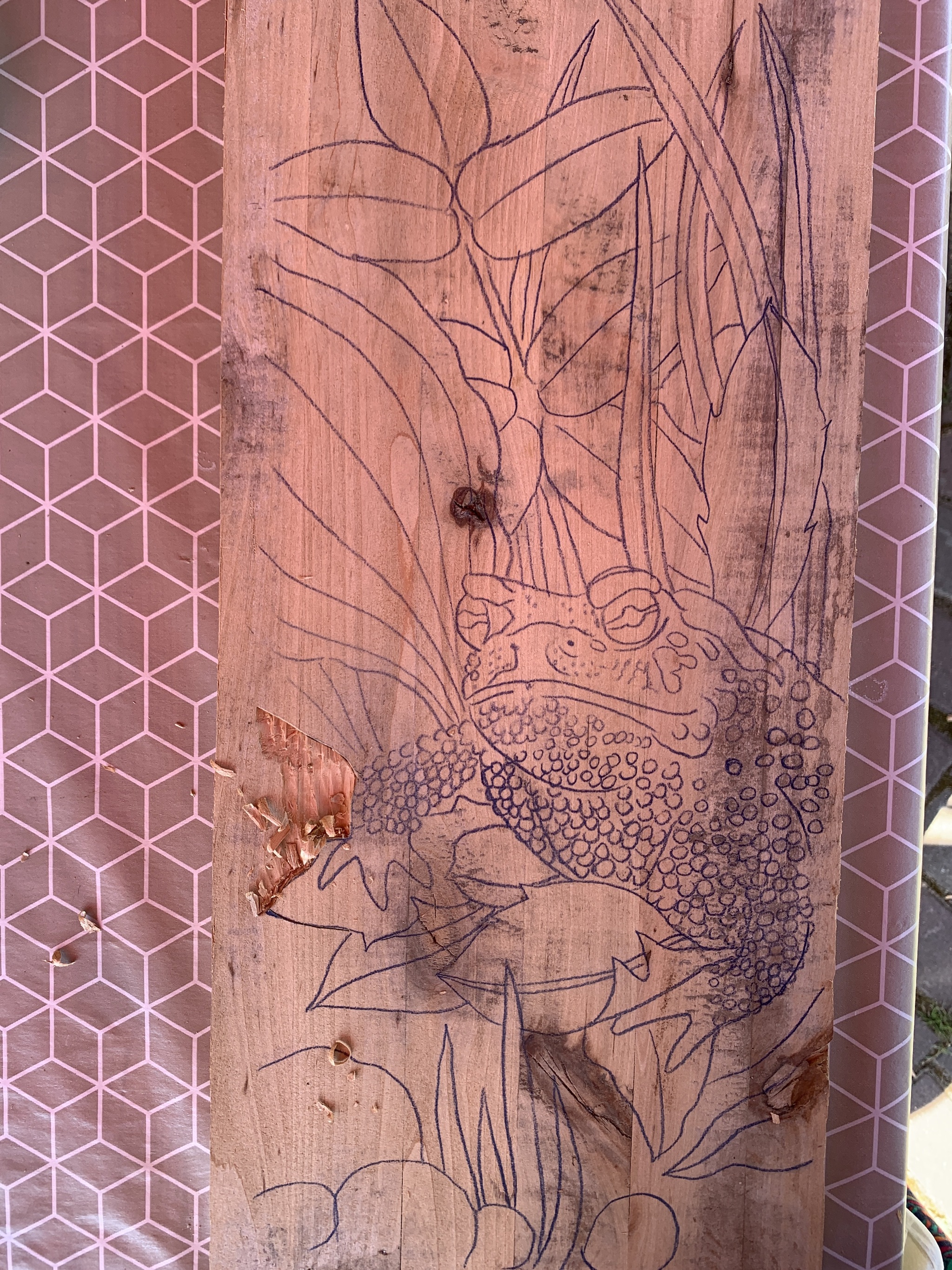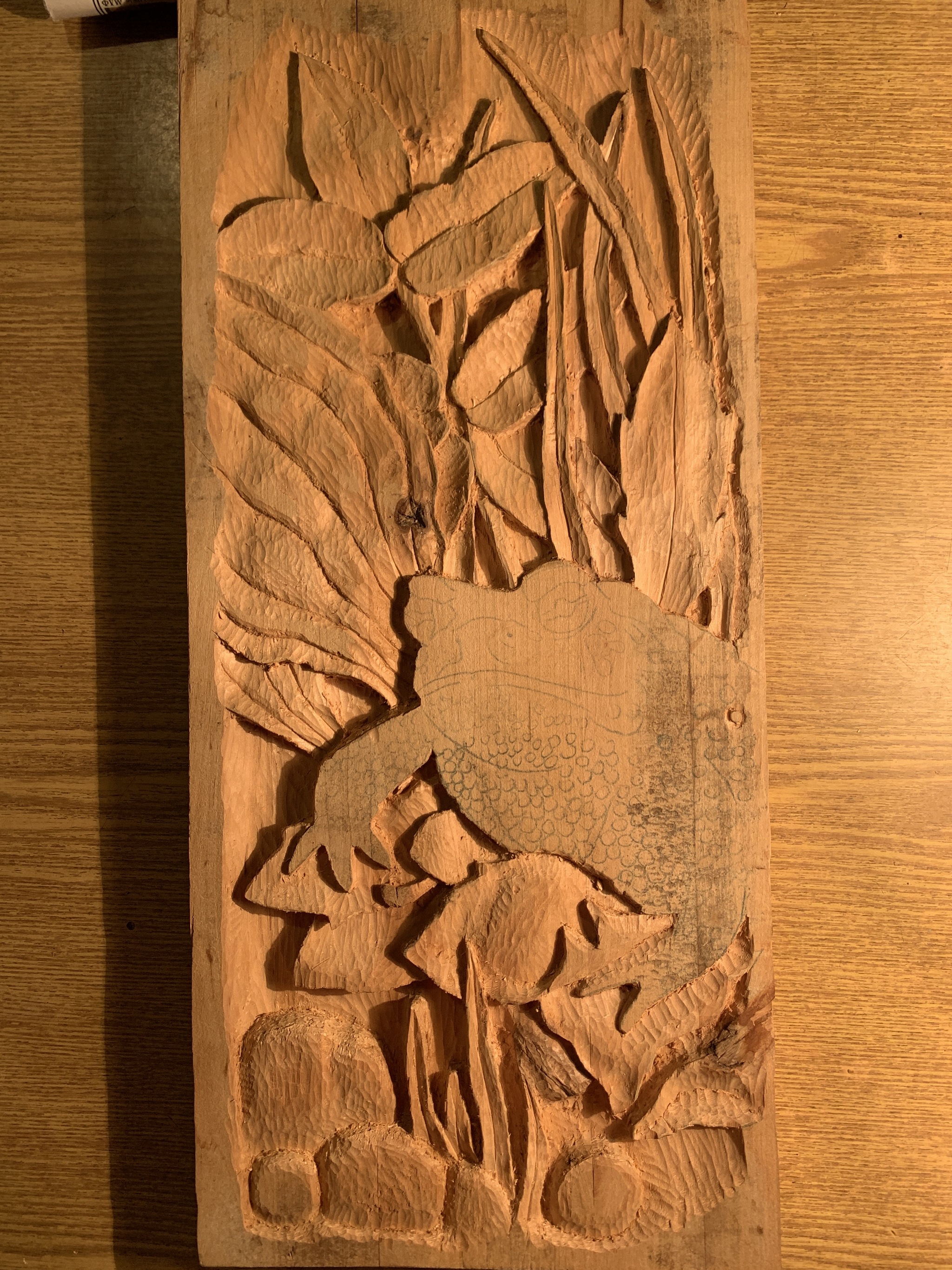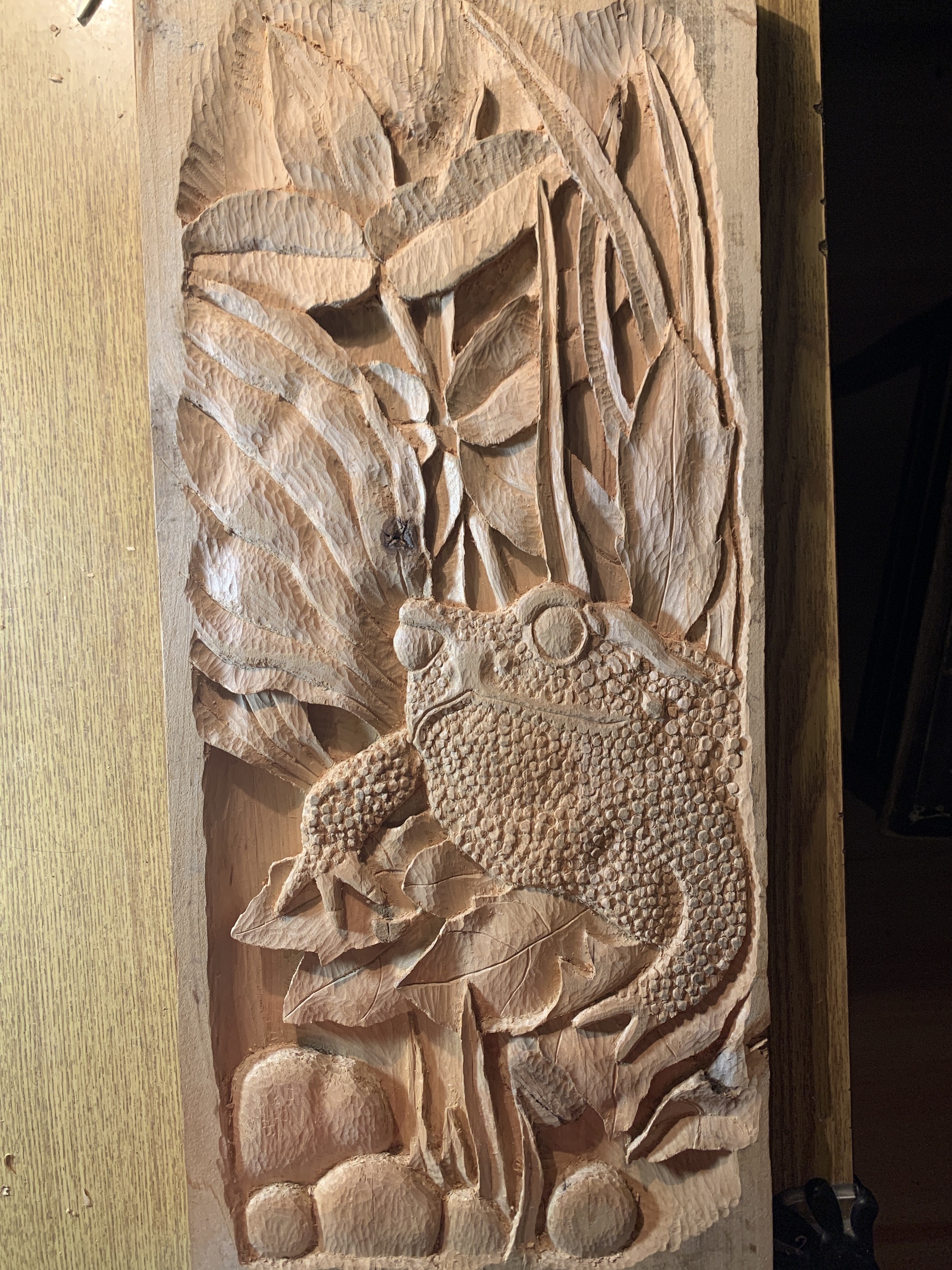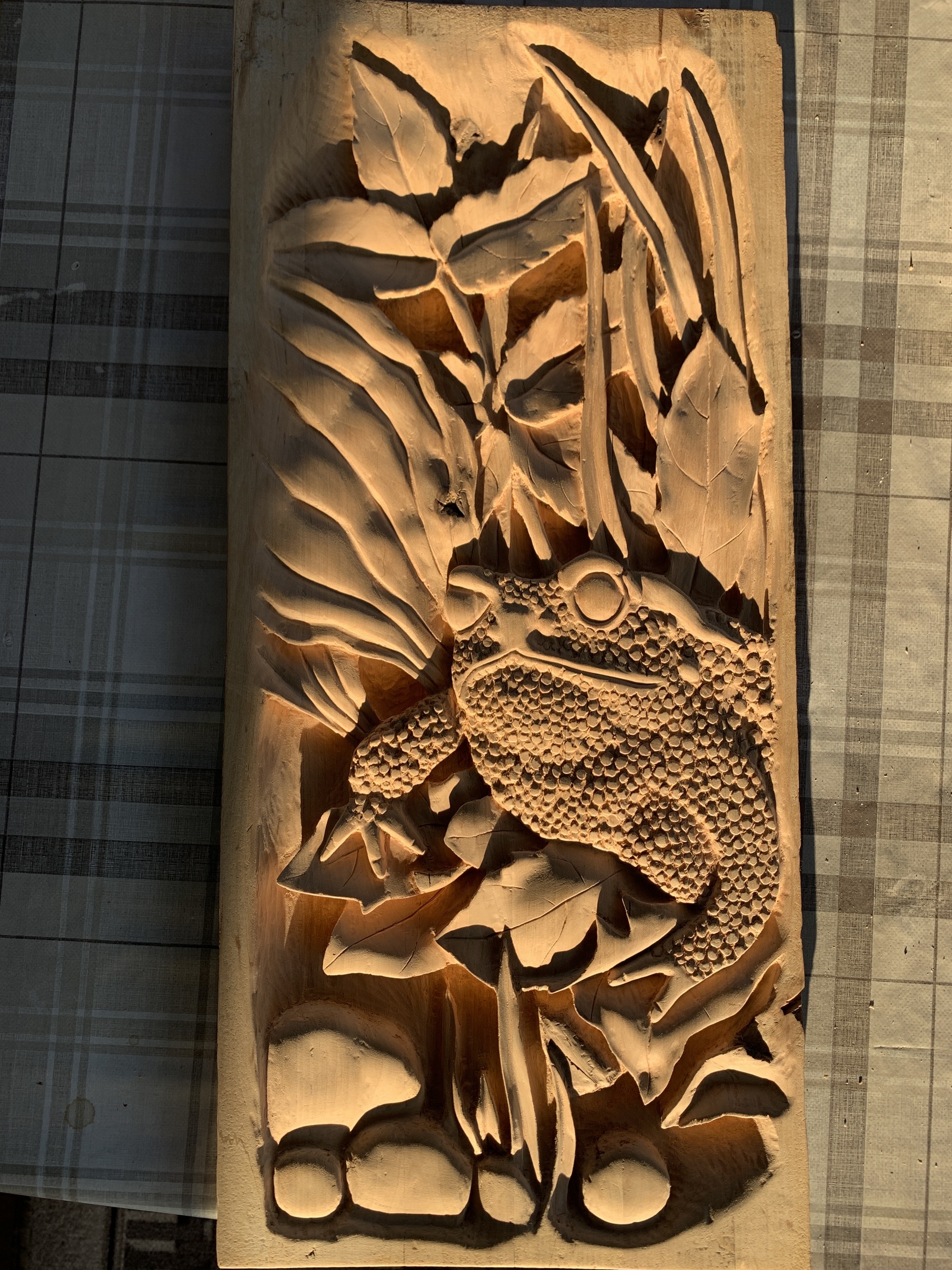 Вырезана из пятидесятилетней осиновой доски, дошедшей до полной кондиции в лесном домике после годов, проведенных под банками с закрутками и тазами с грибами. Она слышала умные разговоры и искренний смех, так что поддалась резьбе очень хорошо. Хотя эти пупырышки чуть не свели меня с ума…