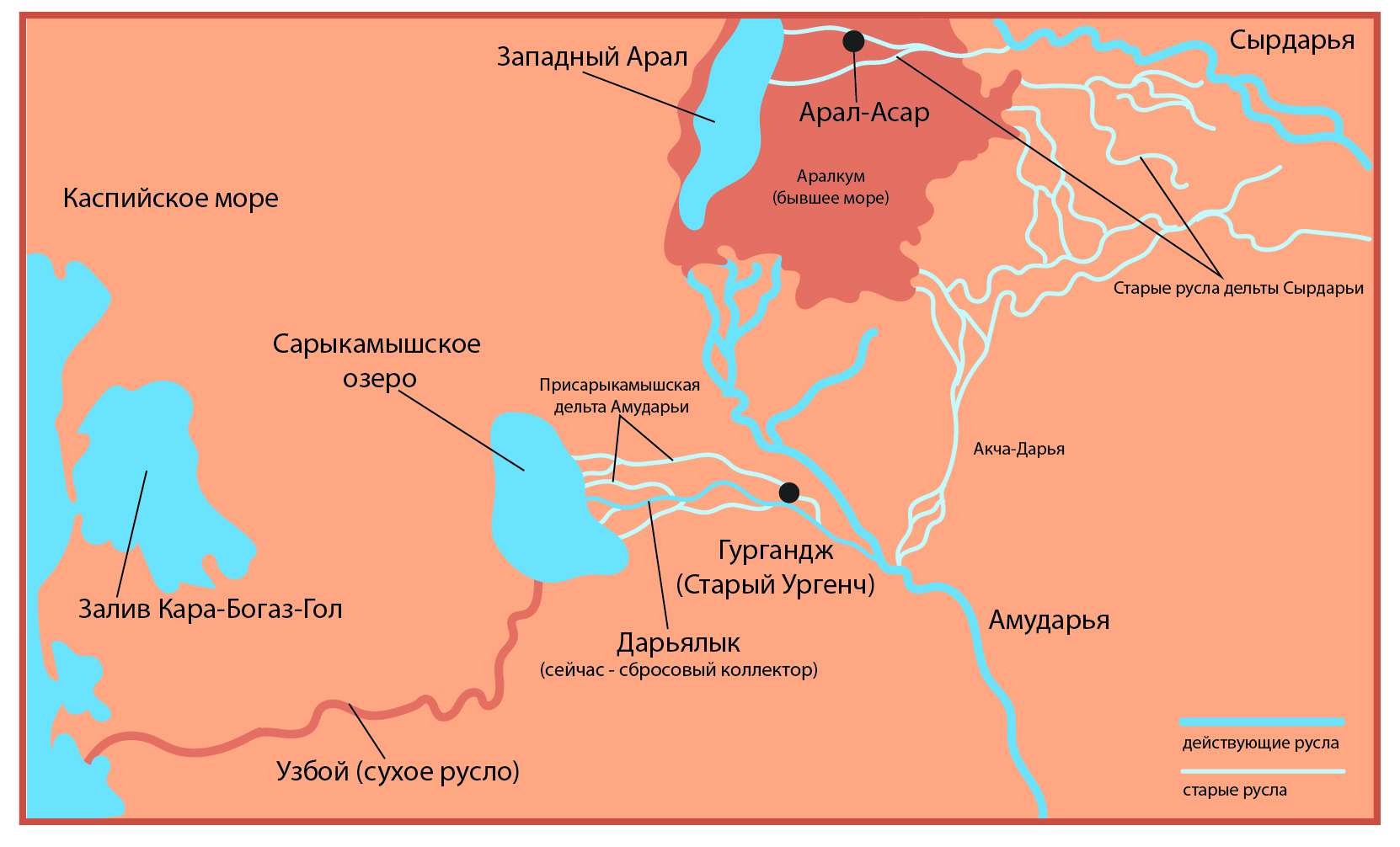 Попробуем реконструировать картину по этим свидетельствам (это уже чисто мои домыслы и фантазии, и ряд вопросов остается без ответа). Стоит процветающий город Гургандж. Он раскинулся на обоих берегах протоки Дарьялык. Эта протока идет в сторону Сарыкамышской впадины, разделяется на рукава и образует древнюю присарыкамышскую дельту. Очевидно, воды в ней достаточно для нужд немаленького населения. В 1221 году приходят монголы и после семимесячной осады захватывают город. Затем открывают плотины и затапливают Гургандж и окружающие селения. Где могли быть такие плотины? Вероятно, выше по течению Дарьялыка, плотина защищала Гургандж от затопления и регулировала поступление воды в протоку. Могло ли быть построено подобное сооружение в 13 веке? Должны ли были остаться какие-то следы от него? Ведь получается, что через Дарьялык хлынула вся масса вод Амударьи, раз Арал обмелел после этого. А до этого, получается, люди отводили воды Амударьи в Арал? То есть трансгрессию тоже следует считать антропогенной?