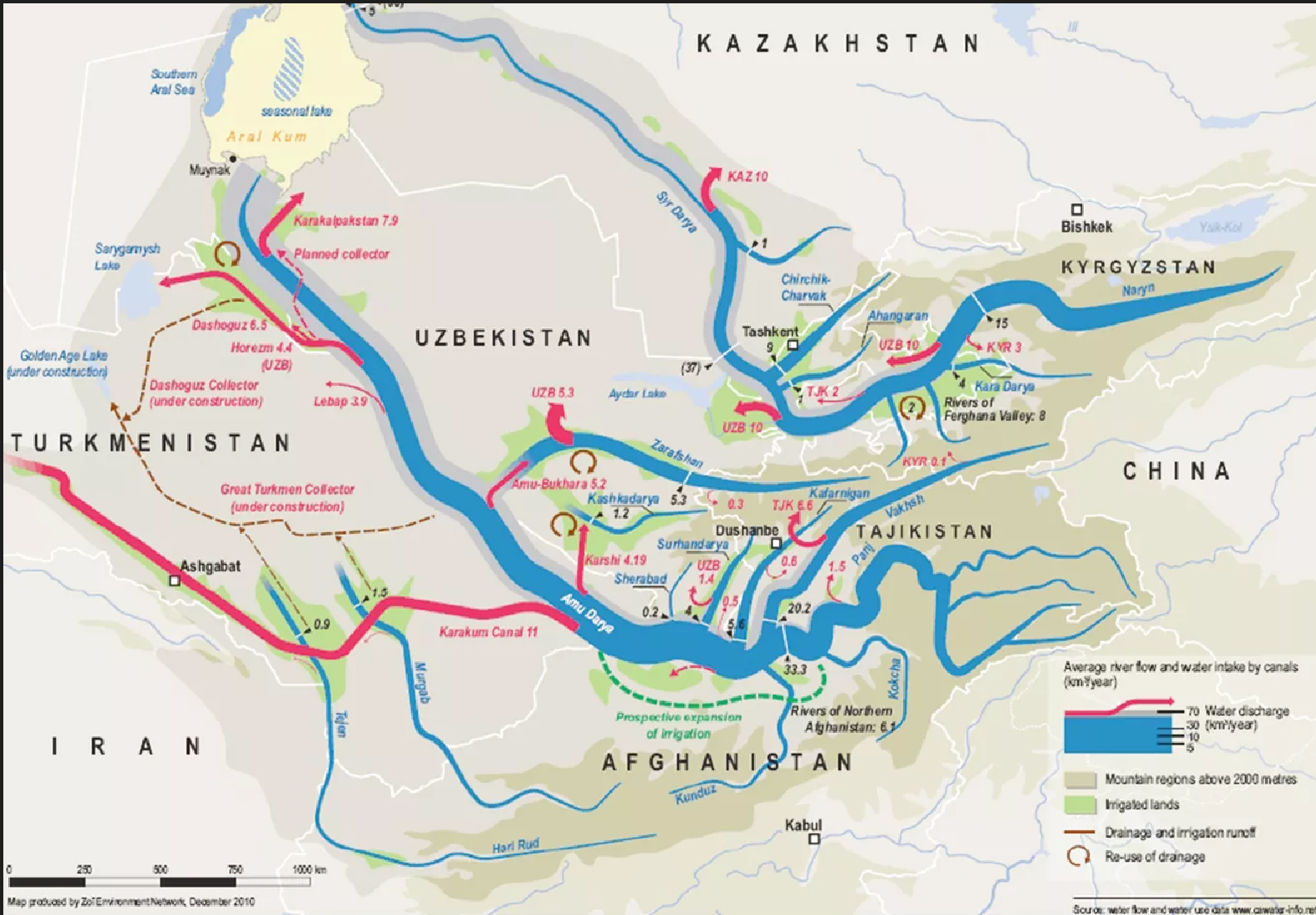 Возьмем данные за 2023 год с сайта cawater-info.net. Суммарный годовой сток бассейнов рек Амударья и Сырдарья в 2023 г. составил 106,06 км3 или 90% от среднего многолетнего стока. Годовой сток бассейна р.Амударья (реки Амударья и Зеравшан) составил 70,78 км3, из которых 56,5 км3 - сток р.Амударья в створе “Условный Керки” (выше водозабора в канал Гарагумдарья). Далее будем говорить только об Амударье, ее вклад более значительный, а воды Сырдарьи вообще не попадают в большой Арал из-за Кокаральской плотины. Забор воды из Амударьи лимитирован. В 2023 году лимиты не были превышены.