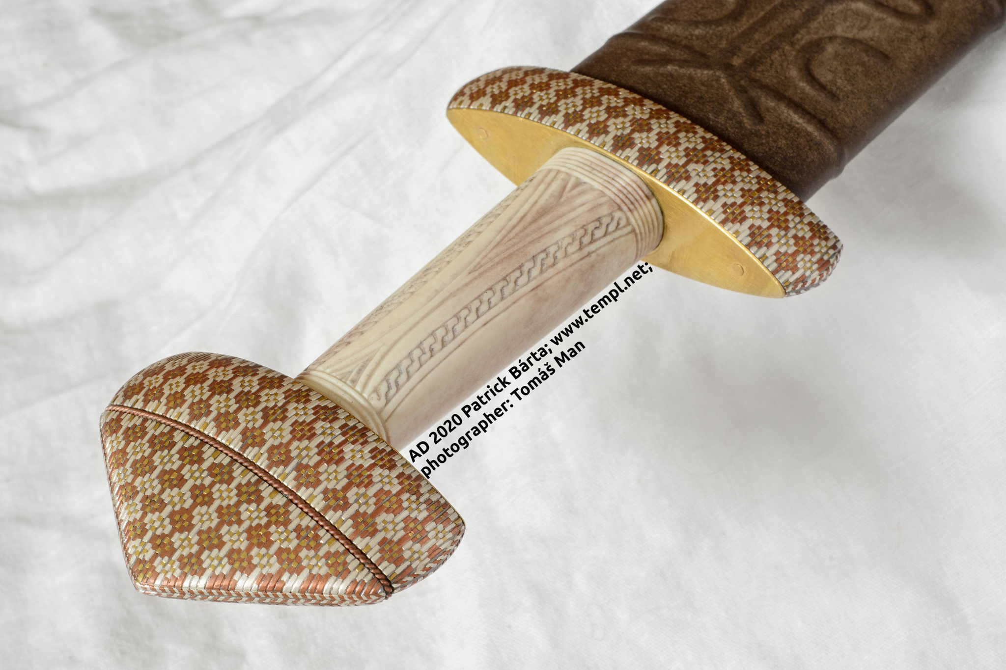 Стальные детали эфеса покрыты инкрустацией по боковым поверхностям. Использованы серебряная, латунная и медная проволоки, что весьма традиционно для драгоценных эфесов скандинавии. Торцевые поверхности деталей эфеса закрыты тонкими пластинами из позолоченой латуни.