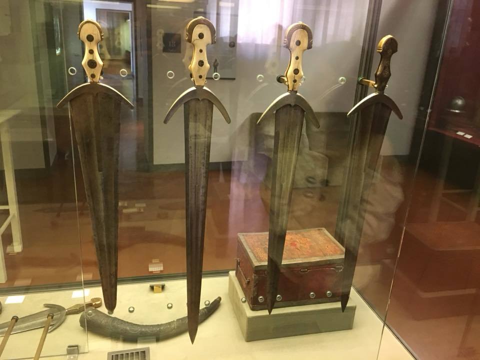 В 16-м веке оружие и доспехи начинают украшать кислотным травлением, что вы можете видеть на клинках двух нижних мечей/кинжалов.