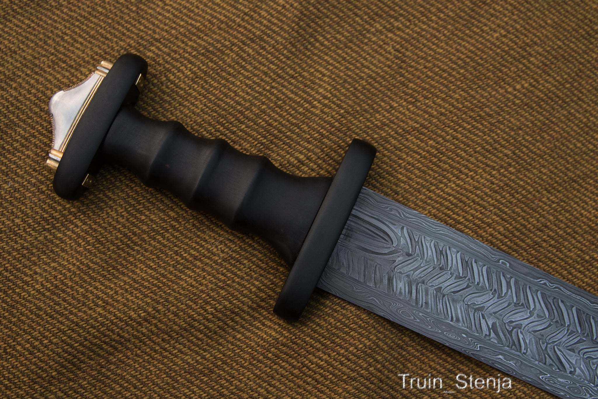 Тело клинка выковано из пяти прутьев дамаска, свареных продольно кузнечным способом. Три центральных прута - перекручены. Два прута перекручены в одну стороны, один - в другую.