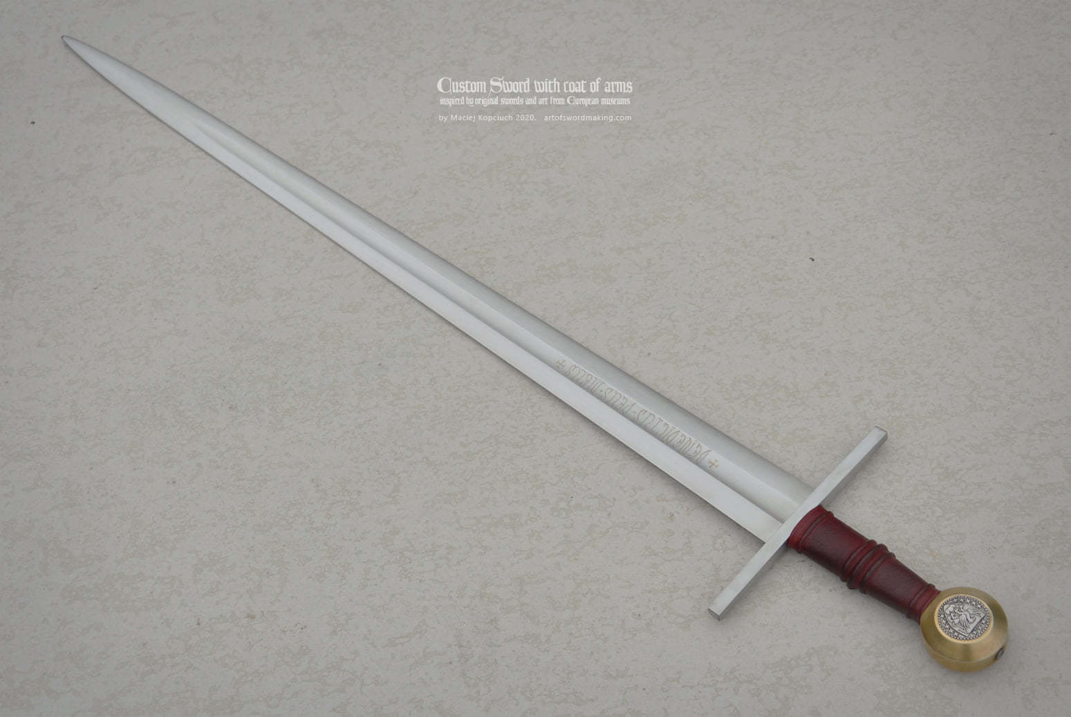 Эфес меча сделан из стали, дерева и кожи, окрашен в гербовые цвета владельца.