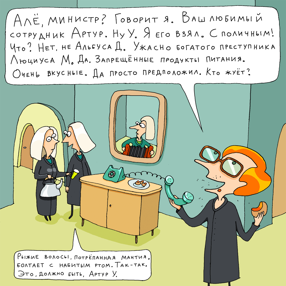 Не найдя никаких запрещённых веществ, Артур У. и его помощники разочарованно двинулись к выходу из роскошного дома. Но тут Артуру У. на глаза попалась стоящая в холле вазочка с печеньем, украшенным свежими оранжевыми ягодами, которые бодро шевелили плодоножками. Артур У. немедленно узнал ягоды с первого взгляда, так как в детстве пожирал их котлами. Это была высокогорная плотоядная девонская земляника, которая, как всем известно, занесена в красную волшебную книгу Англии и запрещена к поеданию.