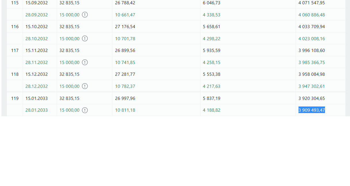 А вот во втором случае, каждый месяц к сумме по графику будем добавлять разницу между новым платежом и изначальным. И уменьшать на нее тело кредита, также понижая ежемесячный платеж еще на чуть-чуть. Т.е. 30 715 - 26 308,84 = 4 406,16 , платеж еще уменьшится и станет 26 273,53. В следующем месяце добавим 30 715 - 26 273,53 = 4 441,47 и т.д.
