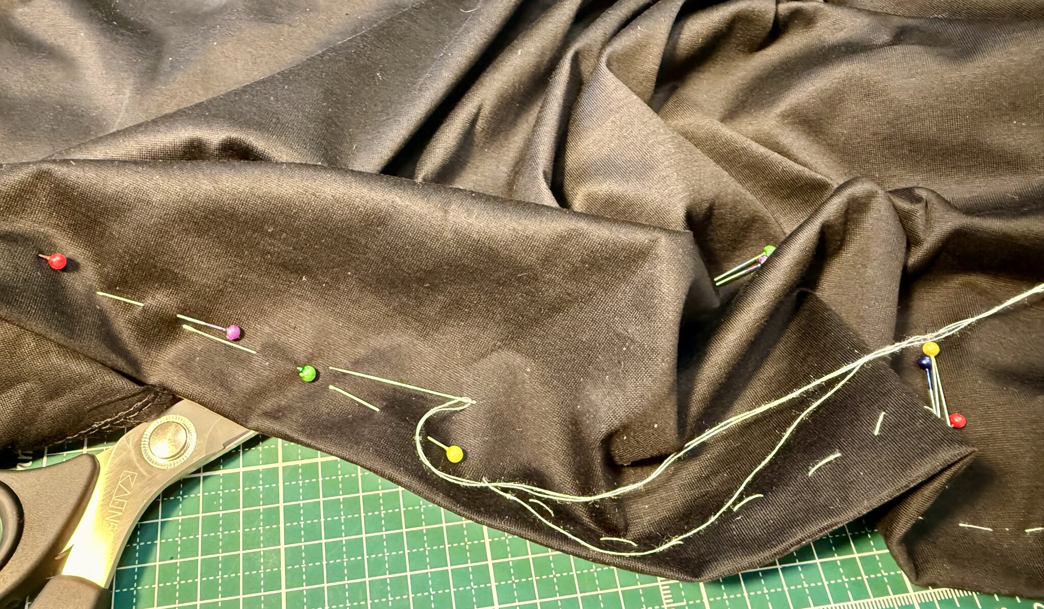 Но самая жесть началась, когда ты уже всё вырезал и пытаешься свести это воедино. Сначала булавками, а потом ниткой сметать. Сууукааа. Оно не совпадааеет!). В этот момент меня точно выбесило всё, и водолазка чуть не была выкинута фпесду. Тыкаешь сверху в линию, а снизу вылазит не там. Бесит. К концу смётки погрешность изделия сильно возрастает, ибо нервы - они не железные.