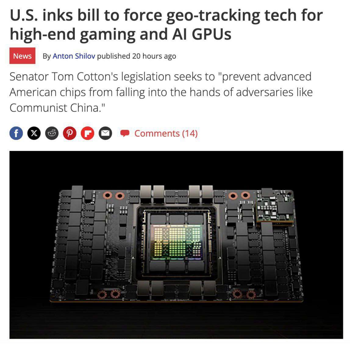 Закон обяжет Nvidia отслеживать каждую проданную видеокарту. Внутри будет установлена геолокация: стоит включить её в «неправильной» стране, и видеокарта мгновенно превращается в тыкву.