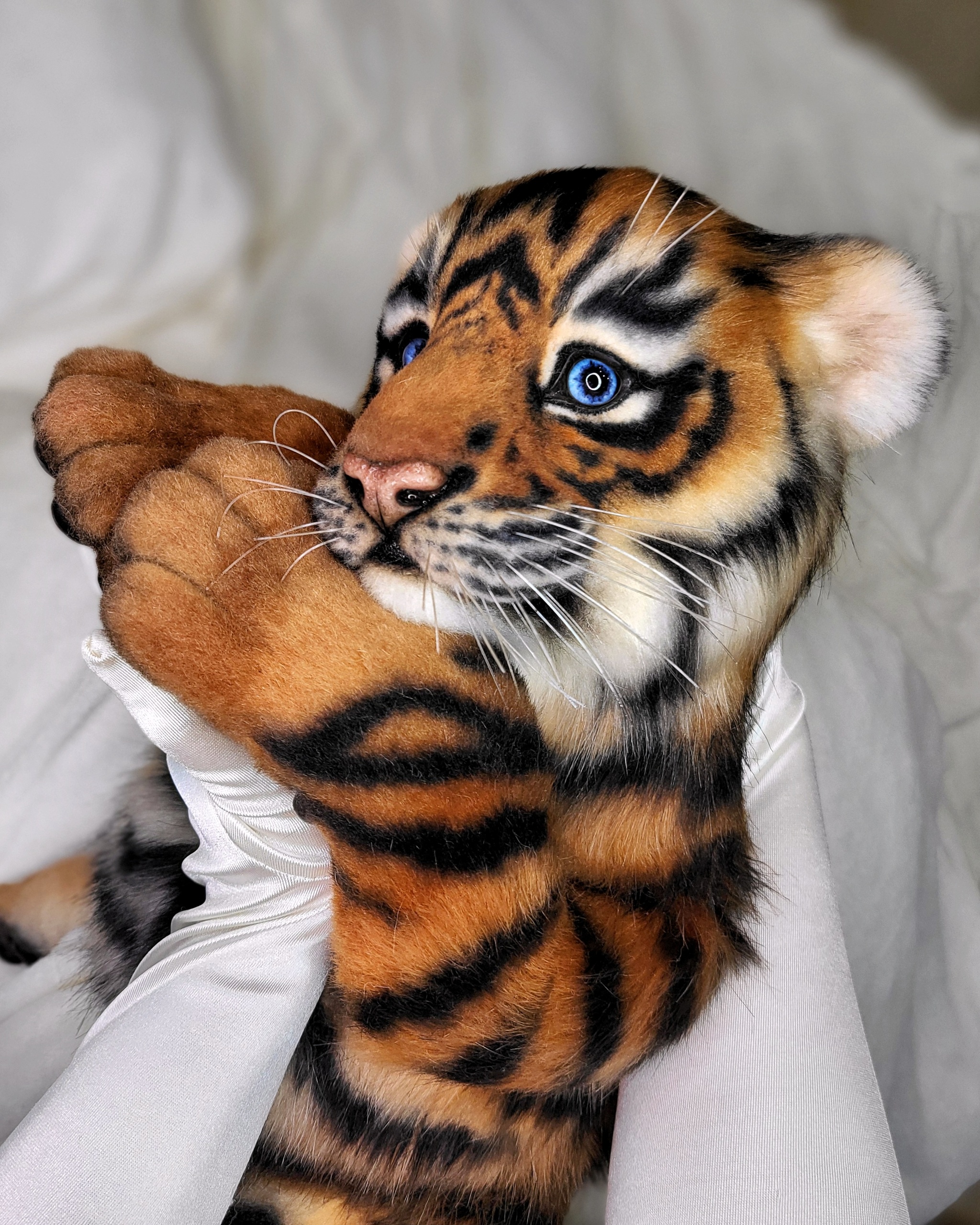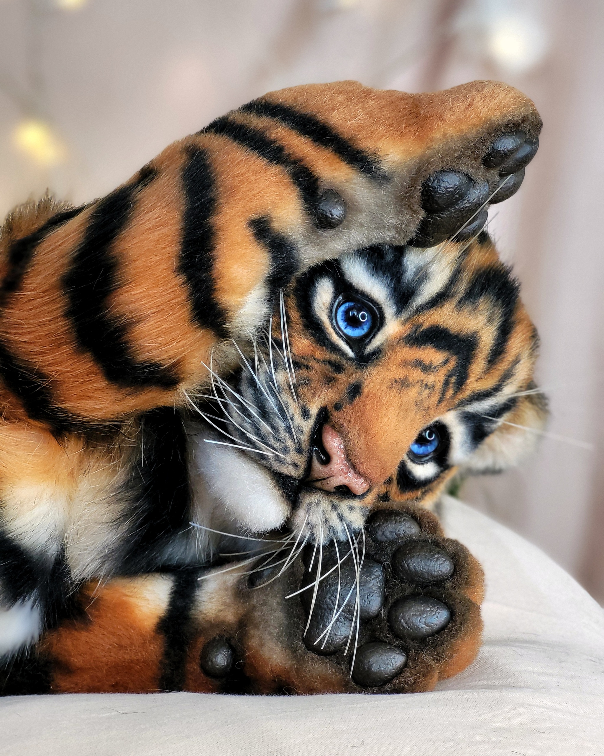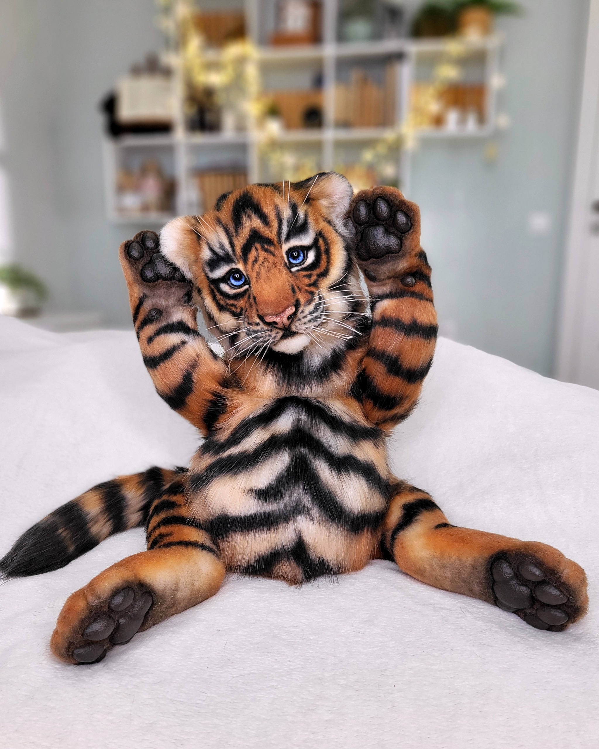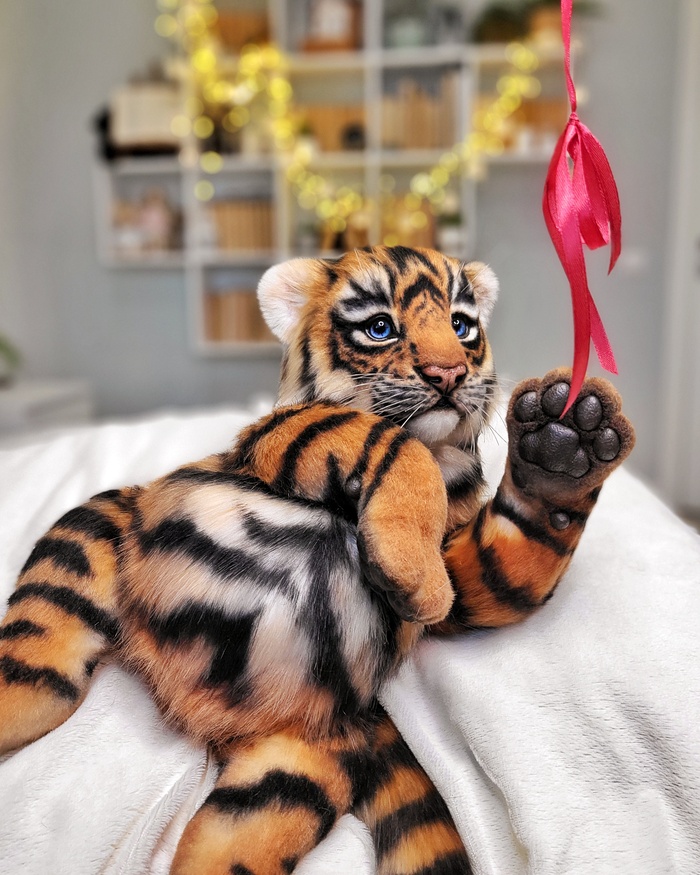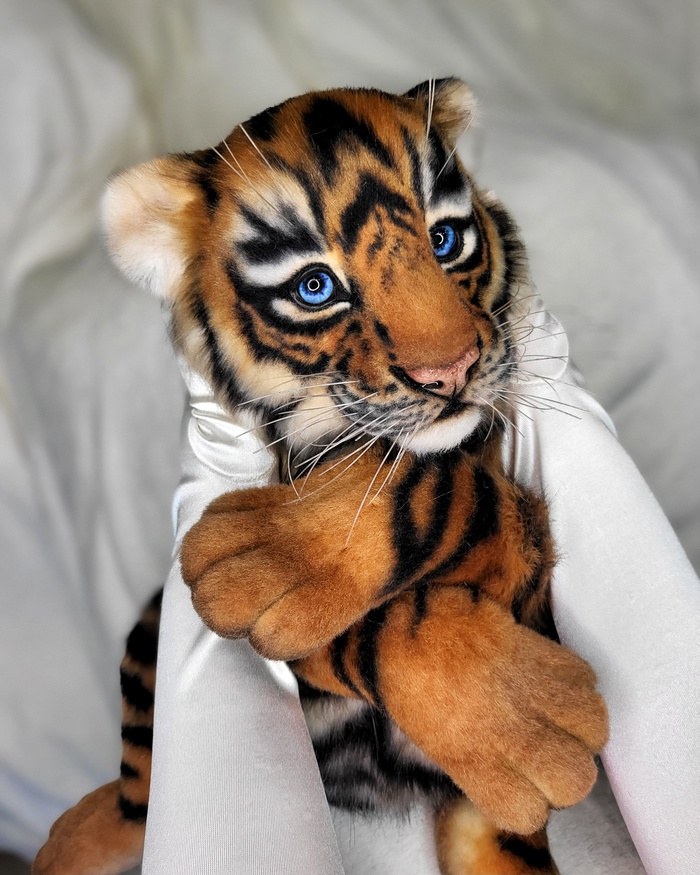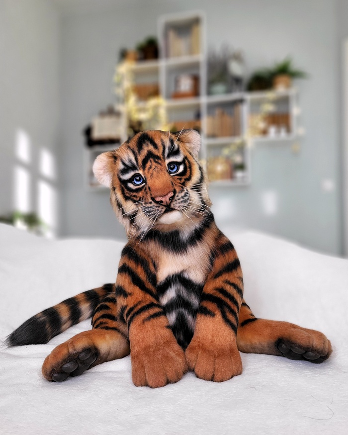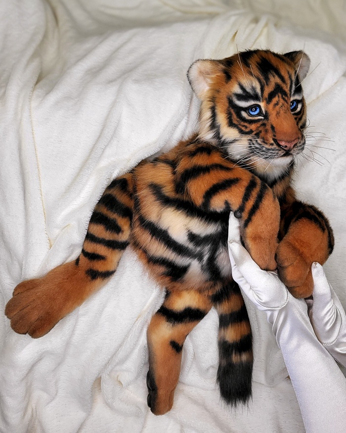 Тигренок сшит из эко-меха, внутри скелет-позвоночник, лапы на шплинтах и дисках (тедди), внутри проволока, т.е они могут менять изгиб