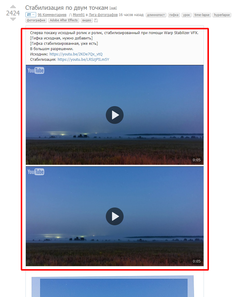 Хочу поделиться своим рецептом стабилизации видео в Adobe After Effects, который я использую для своих таймлапсов. Разработать этот алгоритм мне пришлось из-за того, что я не смог найти ни одной программы, которая бы справилась с такой задачей. Для стабилизации обычным сдвигом кадра в одной плоскости объектив моей камеры слишком широкоугольный и создаёт слишком большие искажения. Необходимо использовать поворот виртуальной камеры с правильным углом обзора и в 3D пространстве.
