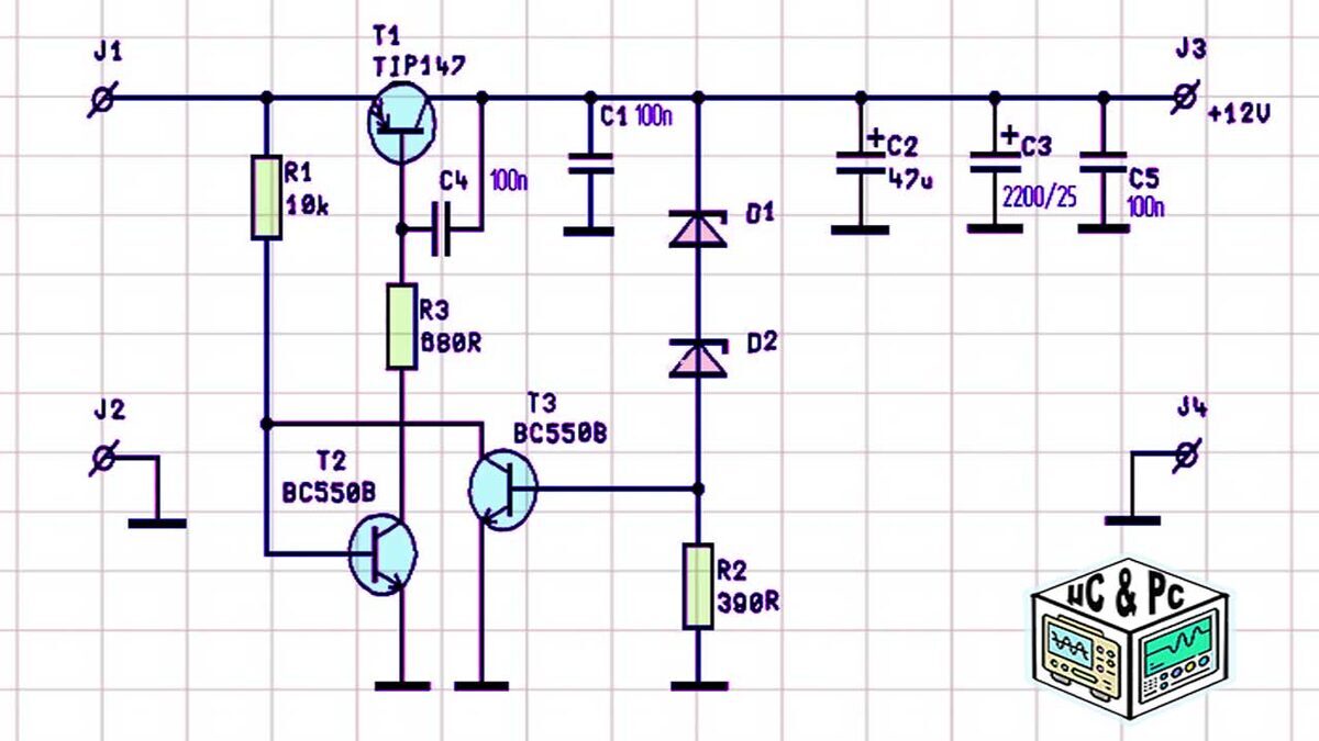 Защита от перегрузок: Резистор R3 ограничивает ток короткого замыкания, защищая схему от повреждений. Ни чего сложного, резистор R3 выполняет двойную функцию, его сопротивление ограничивает ток короткого замыкания стабилизатора, а когда входное напряжение падает ниже 12В, он ограничивает ток, протекающий через переход e-b силового транзистора и T2 на землю.
